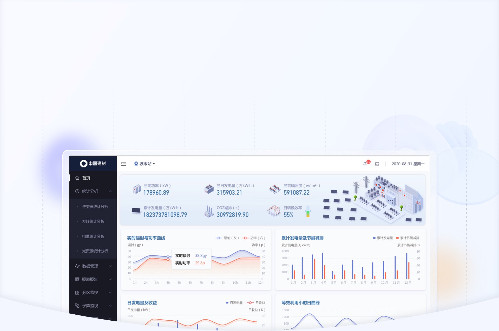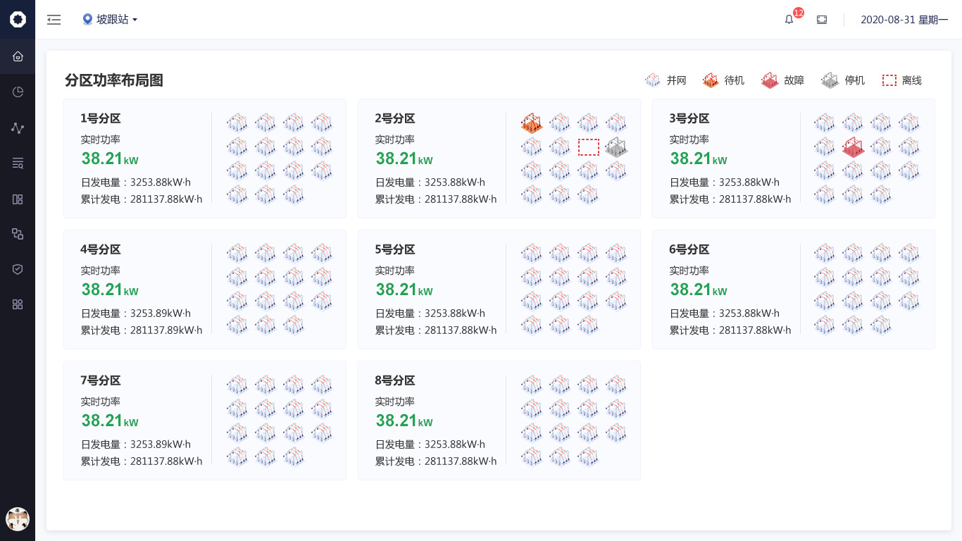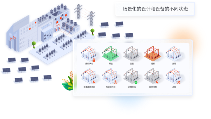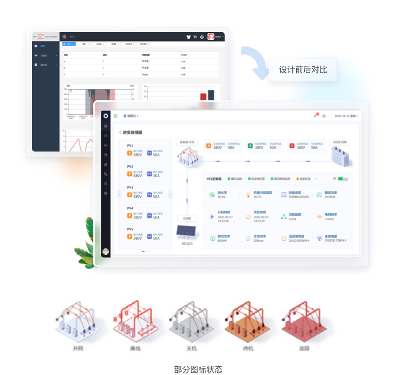 針對數據信息發生的變化,我們使用“場景化設計原則“,用立體圖標方式繪制出從”光伏板-逆變器-交流匯流箱“發電原理圖,把數據展示在對應的環節中,形成可視化的實時監控圖譜。;其余與發電流程無關的數據也均以圖標+文字的形式展示頁頁面右側。