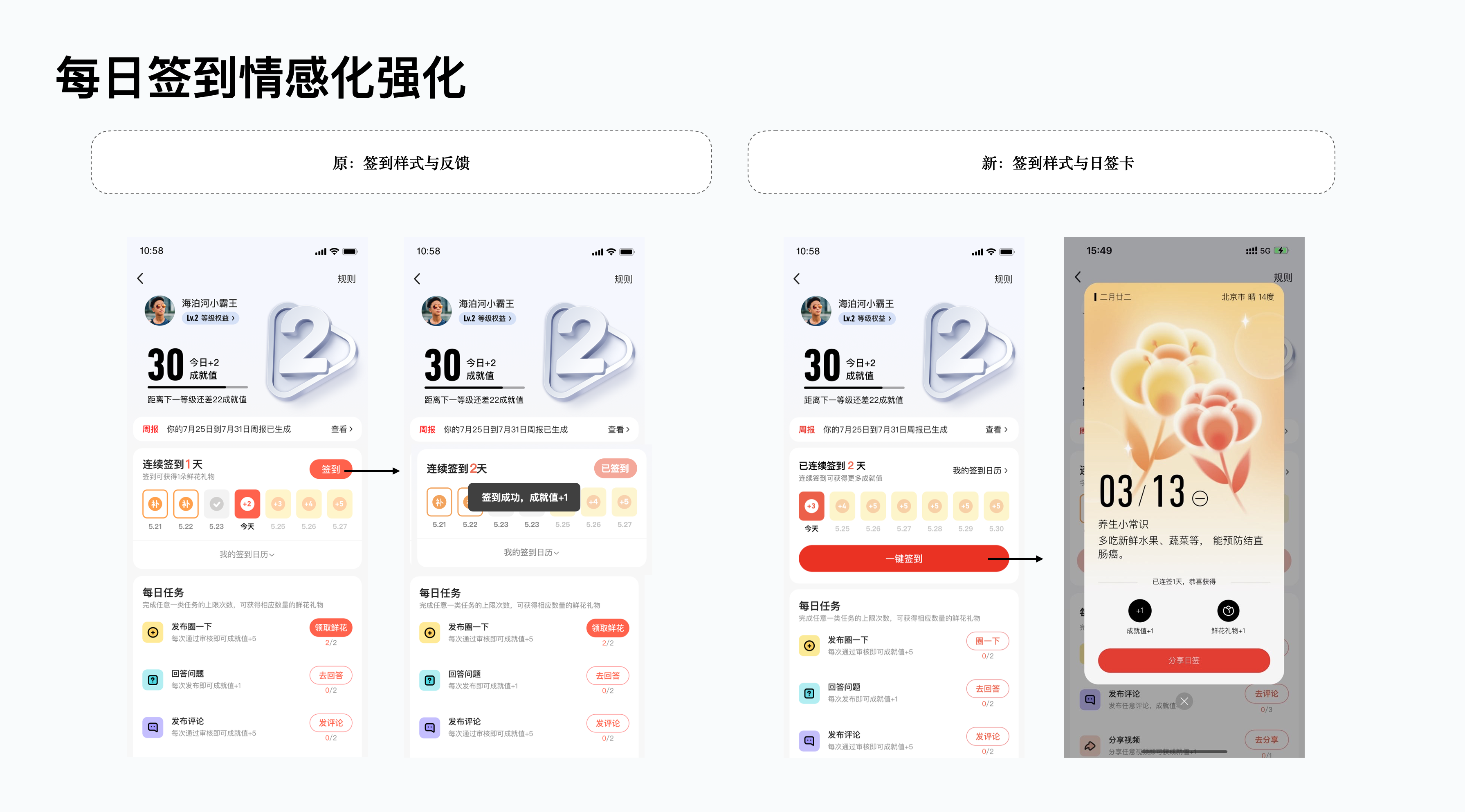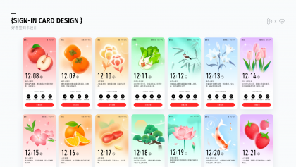 等級中的簽到是最易完成任務類型,部分老用戶始終堅持簽到,甚至達到百日以上,表明簽到系統(tǒng)確實能促進用戶留存。因此設計上強化了簽到按鈕與簽到后的反饋,并衍生出了新的簽到反饋——日簽卡。日簽卡以彌散清新的風格進行對應設計,配合常用的花卉、食材等圖案、文案分別對應中年人愛看的人生感悟、養(yǎng)生常識、歷史上的今天,溫馨感十足,上線后還吸引了大量用戶分享保存日簽卡,極大的提升了簽到用戶的次日留存。