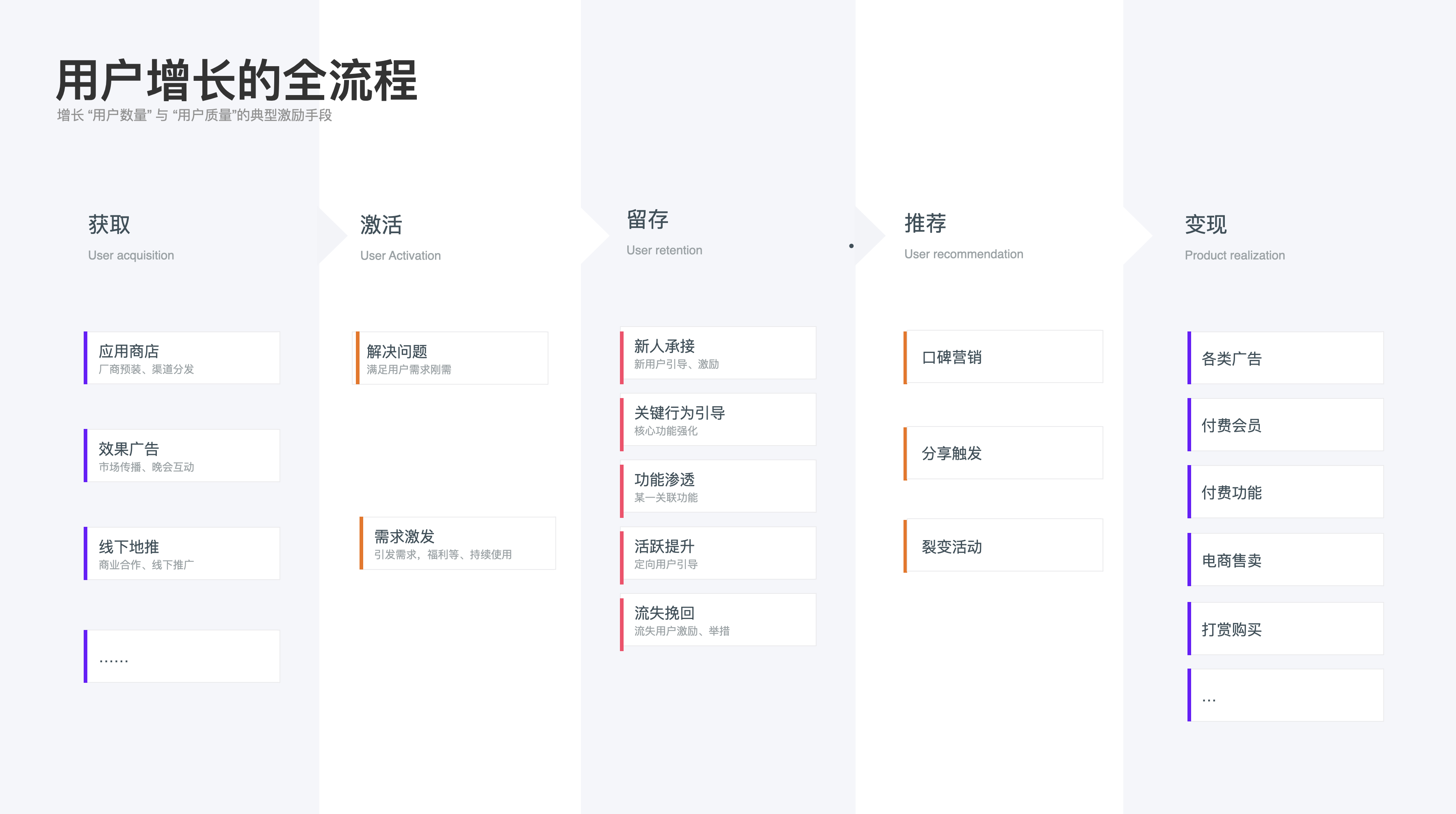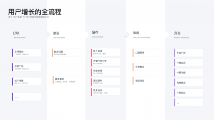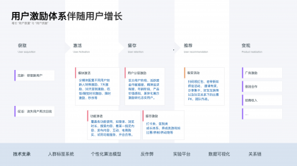 以上是用戶視角下的激勵體系,下面講講產品業(yè)務下的激勵體系的作用,通常情況下激勵體系伴隨著用戶增長的全流程“獲取—激活—留存—推薦—變現(xiàn)”各個過程。用戶增長代表著增長“用戶數量”與“用戶質量”,以上三類激勵方式都會在產品增長的各流程中承擔著不同程度的促進作用: