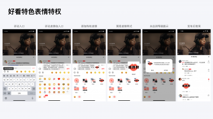 特權表情方面:我們通過評估5w條好看視頻評論數據,選出高頻關鍵詞10條,同時投放到社群用戶中進行投票選舉,宣出我們用戶最更偏愛的交流詞匯,最終選出6個表情包文案:支持、點贊、厲害了、說得好、學到了、好人一生平安。隨后開始根據這五條內容進行表情圖案創(chuàng)作,打造具有好看特色、正向有梗的視覺系統(tǒng)。好看用戶下沉且年齡較大,對醒目直白、突出重點、易讀易懂的設計更偏愛。因此圍繞文字繪制了一套簡單明確又具備詼諧感的表情包圖案,在用戶傳播上也能更易傳播,更能能打造好看品牌的互動記憶點。