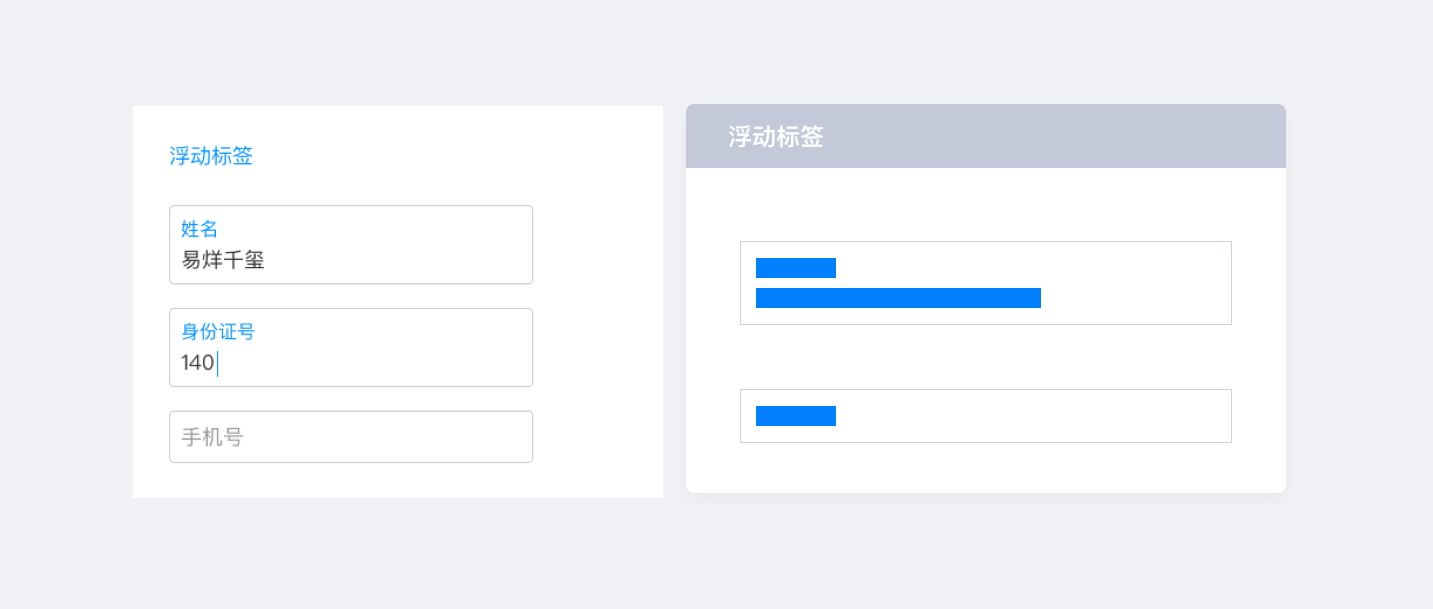 他是在未填寫或未激活的狀態為行內標簽樣式,在激活或已填寫的狀態下為頂部標簽。浮動標簽是行內標簽和頂部標簽的結合體,移動端推薦此設計;消除了頂部標簽的閱讀障礙,同時解決了行內標簽填寫后高效無法檢查的弊端。