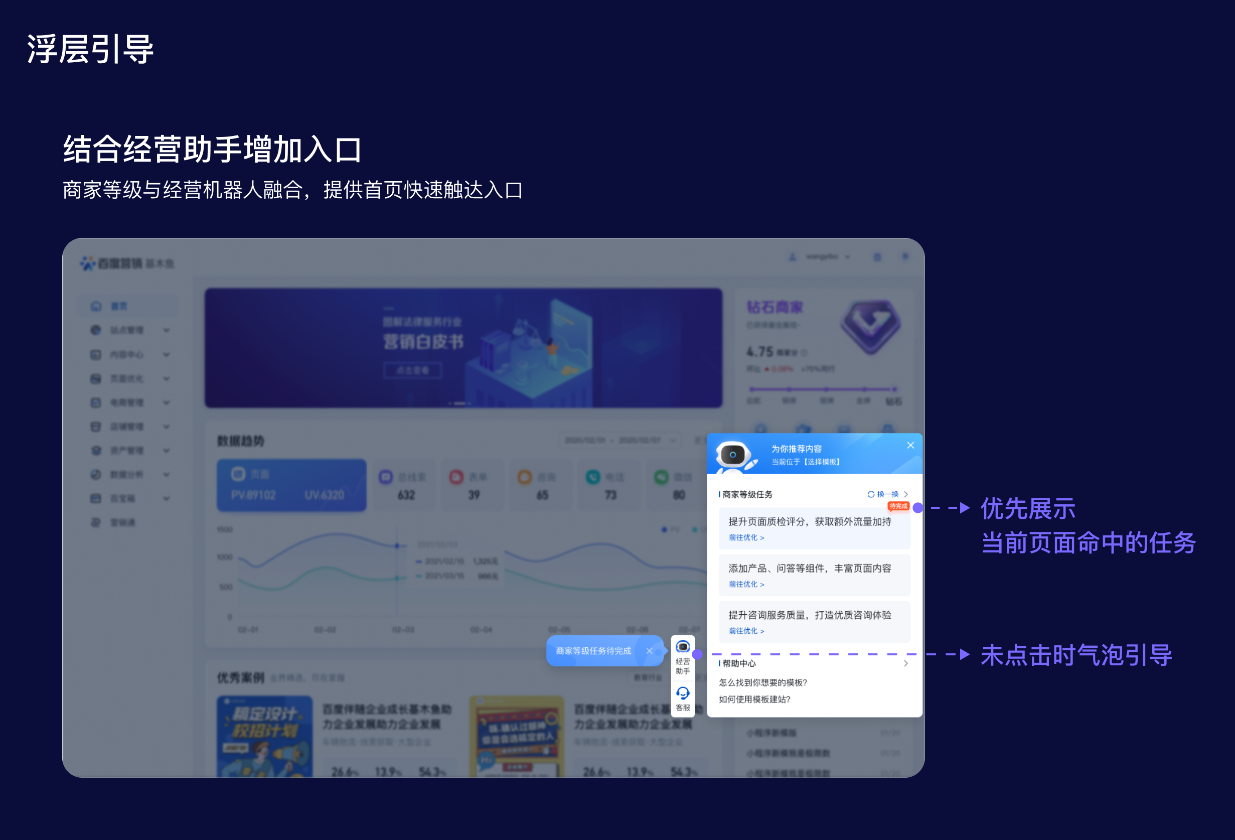 浮層:將操作入口前置披露,提升商家感知同時還可以縮短操作步長。在商家等級項目里,衡量商家主動經營的標準是做任務,所以任務入口的前置披露是提升主動經營的關鍵舉措。于是,圍繞商家等級包裝了“經營助手”的概念,幫助平臺給商家推薦一些成長任務和優化建議,并在平臺首頁主動彈出,以此提高任務觸達率。但使用這種主動觸達手段時,需要考慮對商家的打擾和阻斷情況,所以需要對主動彈出的頻率作限制,然后配合氣泡和標簽等視效元素吸引商家視線。這樣可以引導商家參與商家等級完成任務,促進其成長和等級提升。