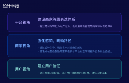 設計的基本出發點是幫助業務建設平臺等級模型的表達體系,將業務目標轉化為用戶行為,設計清晰而直觀的商家分層表達體系,將不同商家等級與其對應的特權、服務等信息進行明確的關聯和傳達,以便商家能夠快速理解和辨識商家等級的差異和優勢。