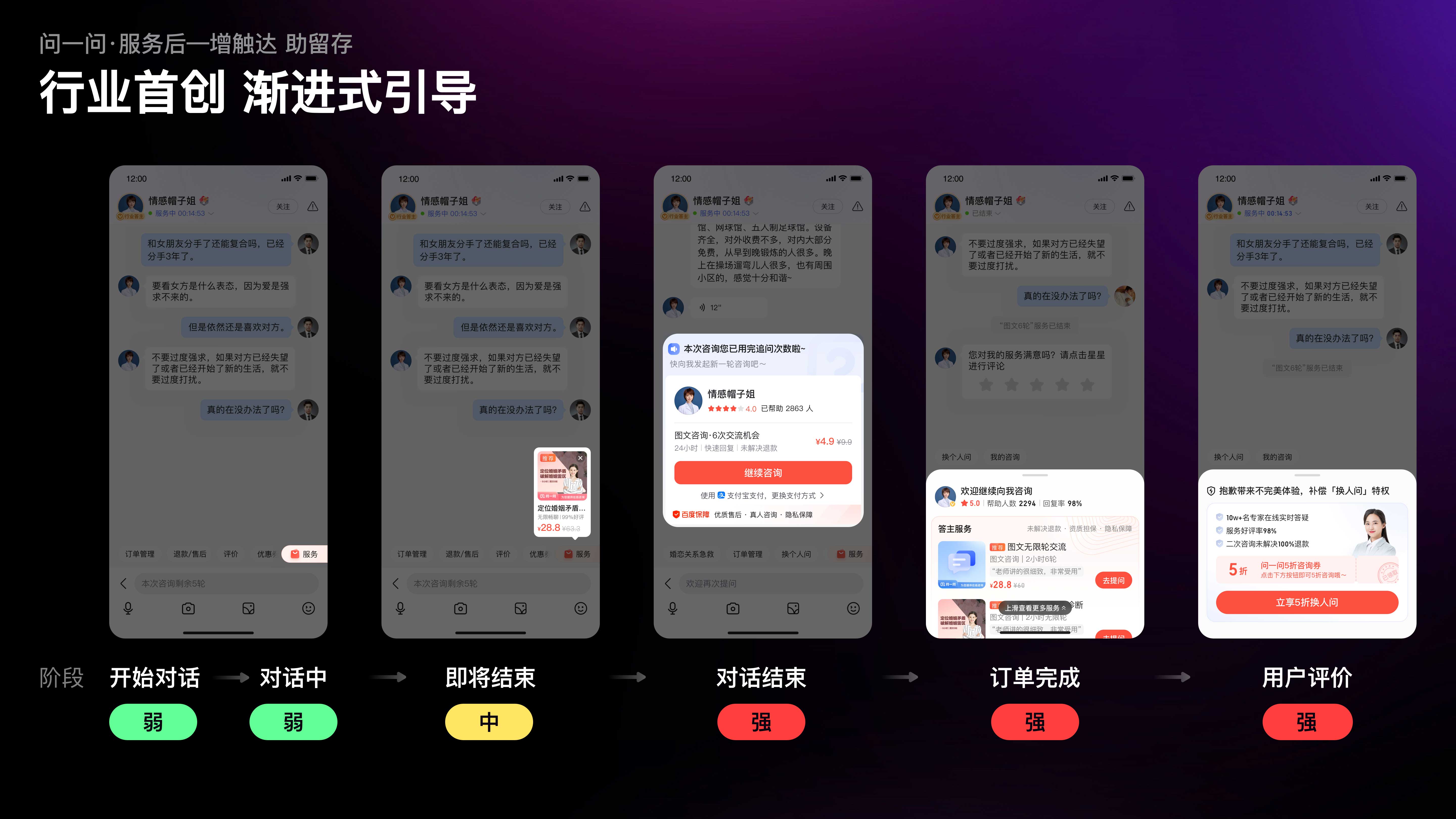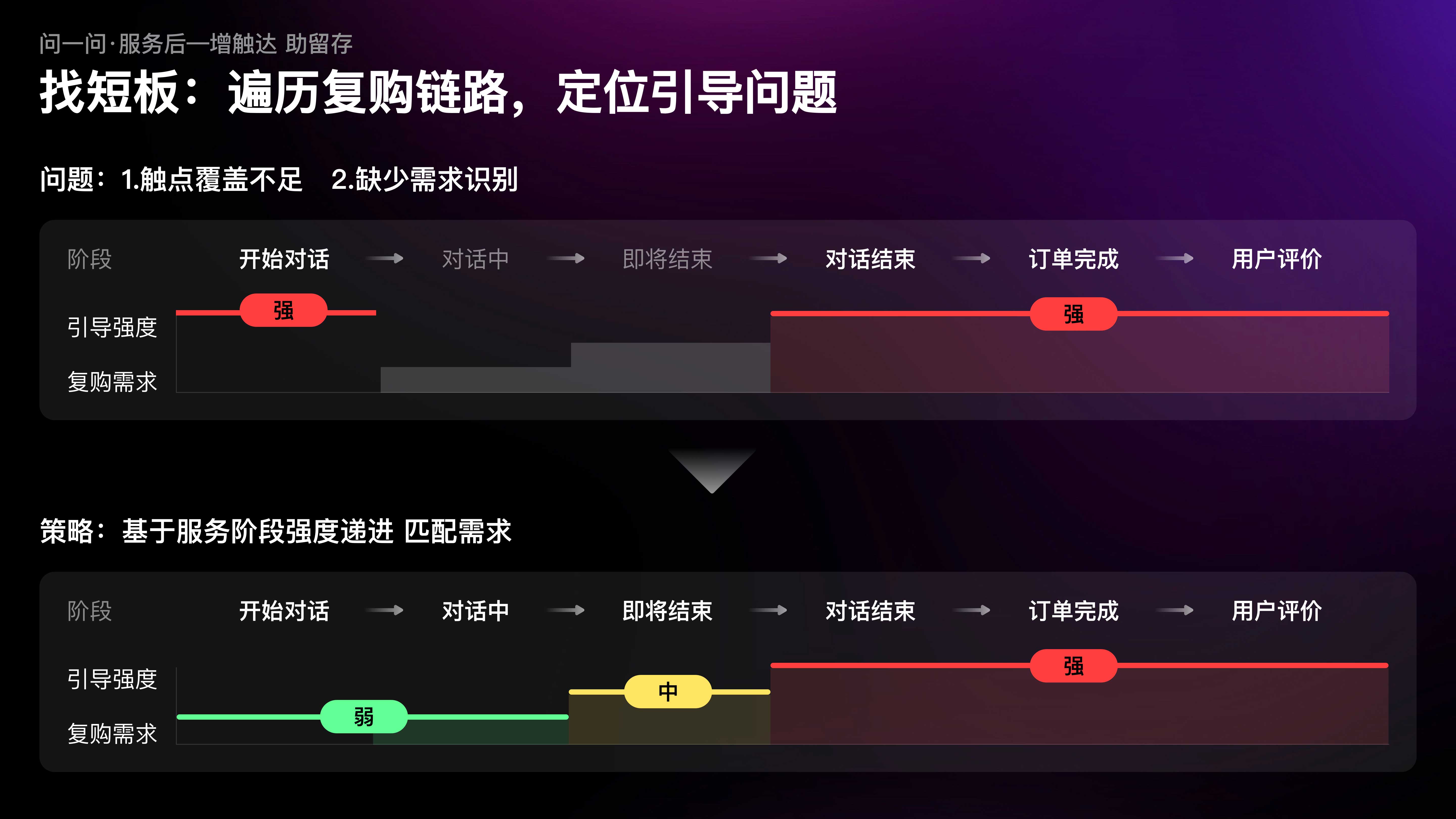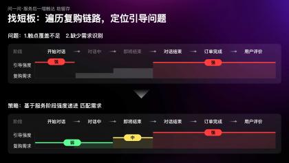 當(dāng)我們以用戶視角,遍歷咨詢鏈路中的復(fù)購引導(dǎo)時,發(fā)現(xiàn)復(fù)購引導(dǎo)的觸點覆蓋不足,且缺少對特定場景下需求的識別,例如在咨詢開始時復(fù)購需求極弱,但設(shè)計引導(dǎo)極強(qiáng);而在隨后的對話過程中需求漸增,但引導(dǎo)缺失。因此,我們制定了行業(yè)首創(chuàng)的漸進(jìn)式引導(dǎo)策略;隨著服務(wù)推進(jìn),復(fù)購需求漸增,觸達(dá)強(qiáng)度也逐級遞進(jìn)。