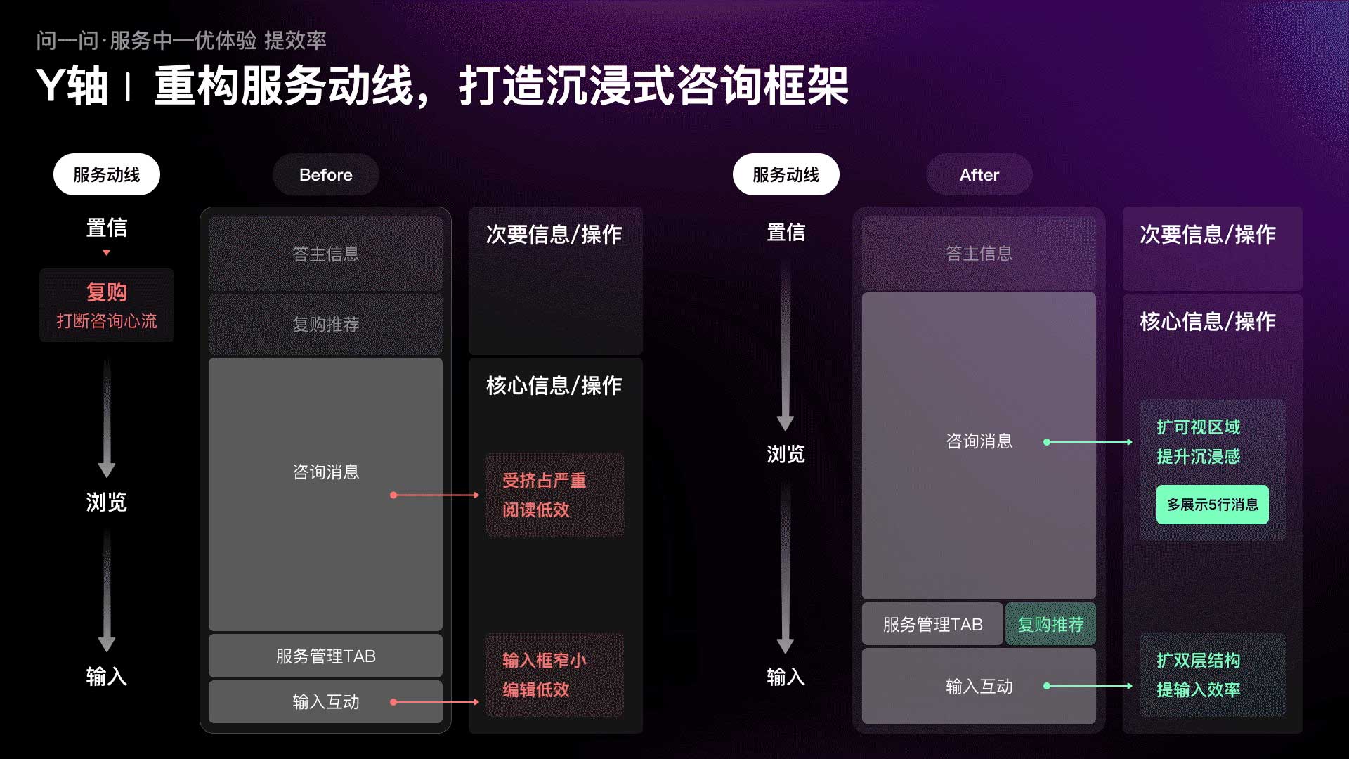 ?到了新的發(fā)展階段,我們的設(shè)計愿景該如何實現(xiàn)?問一問設(shè)計團(tuán)隊以“服務(wù)體驗”為原點,發(fā)起了C端核心服務(wù)體驗的升級專項。借助用戶觀察、體驗遍歷等方法,沿用戶真實體驗路徑梳理服務(wù)“前-中-后”各階段的關(guān)鍵問題、挖掘優(yōu)化機(jī)會。再結(jié)合設(shè)計、體驗雙視角,建立以服務(wù)前“建認(rèn)知、促轉(zhuǎn)化”、服務(wù)中“優(yōu)體驗、提效率”、服務(wù)后“增觸達(dá)、助留存”為核心指導(dǎo)原則的設(shè)計打法。通過切實滿足用戶在服務(wù)各階段需求來激發(fā)持續(xù)消費(fèi)、讓服務(wù)閉環(huán)順暢運(yùn)轉(zhuǎn),從而有效地賦能業(yè)務(wù)增長,達(dá)到體驗和收入的雙豐收。