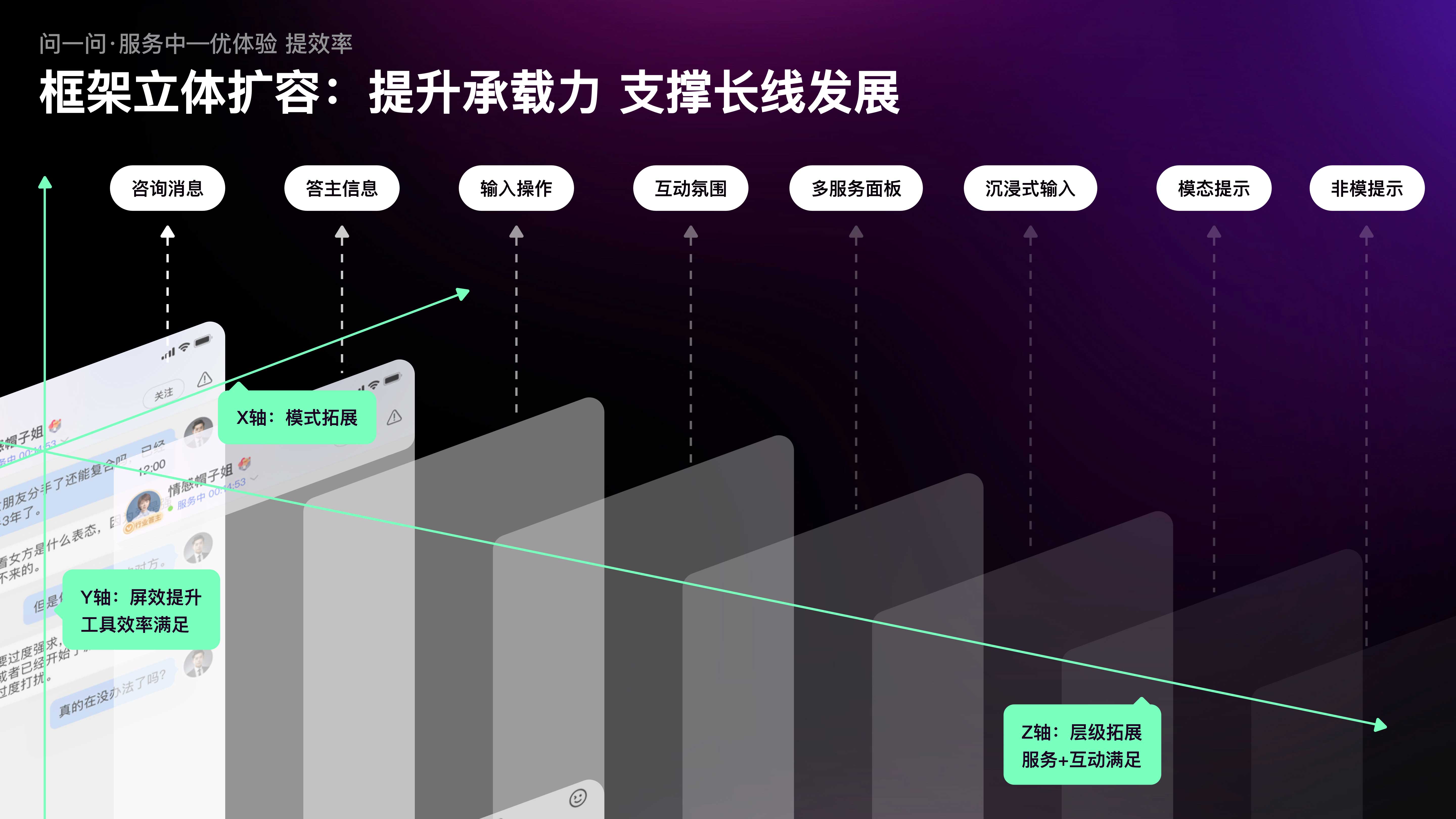 為實現(xiàn)這個目標(biāo),我們突破現(xiàn)有框架,創(chuàng)新制定了沿XYZ軸立體擴(kuò)容的思路。在Y軸方向上,進(jìn)行了屏效的優(yōu)化,滿足工具提效需求;沿Z軸拓展了層級,滿足多元服務(wù)和互動需求;最后,沿X軸探索第二空間,承載創(chuàng)新型體驗。