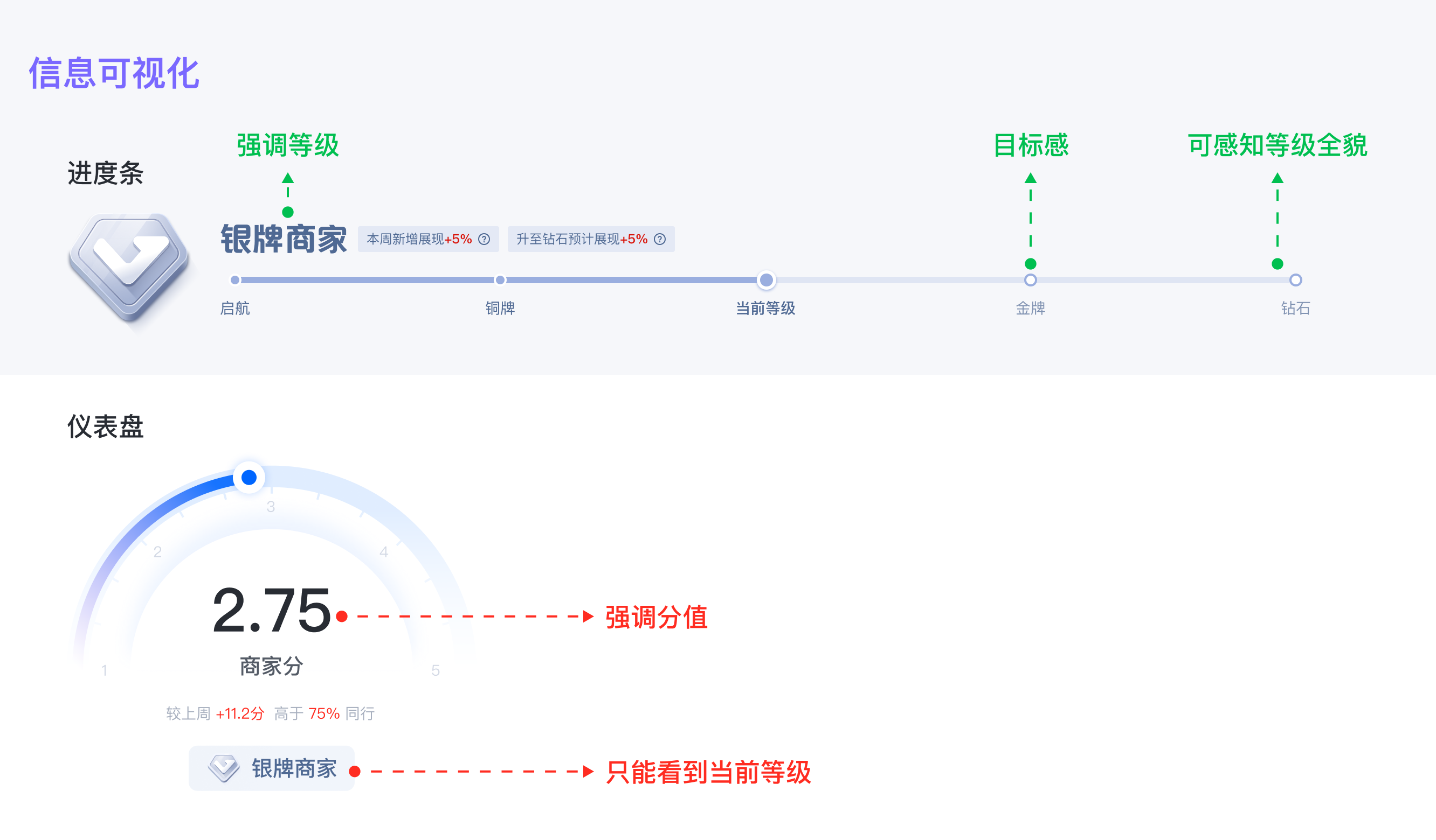 當復雜的信息難以被商家理解時,可視化作為有效手段,旨在把數據資料以視覺化的方式表現出,有效地向受眾傳播信息。可視化首先要根據信息結構進行圖表選型,在商家等級項目中,我選擇了兩種數據圖表(進度條VS儀表盤)來進行商家等級的可視化表達,當兩種圖表放到一起時,可以很明顯的發現兩者之間的差異,基于這個項目想要強調的等級概念,最終選擇進度條展示商家等級的成長進度,并激勵其追求下一個等級的提升。這樣,商家能夠準確感知成長進度,衡量自己在商家等級體系里所處的分位以獲取更多成長動力。