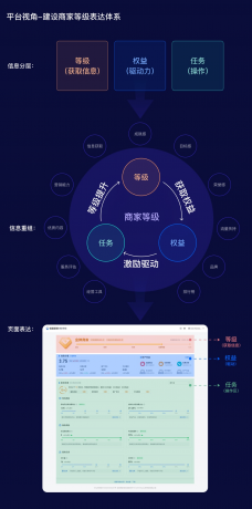 設計的基本出發點是幫助業務建設平臺等級模型的表達體系,將業務目標轉化為用戶行為,設計清晰而直觀的商家分層表達體系,將不同商家等級與其對應的特權、服務等信息進行明確的關聯和傳達,以便商家能夠快速理解和辨識商家等級的差異和優勢。