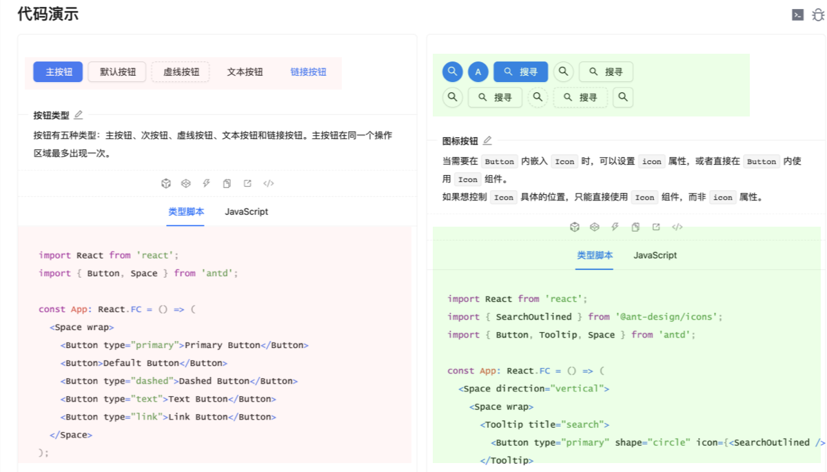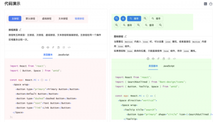 組件和組件庫的設計和搭建過程中,需要了解系統平臺,是蘋果端還是安卓,web端,不同的系統設計的差異性很大,對應系統的控件類型我們也要很熟練的掌握。例如安卓一直保留的原生的底部導航欄的操作控件(返回、主頁、菜單),反觀蘋果最早出現在底部的HOME鍵,隨著硬件設計的升級,物理按鈕的作用已經完全被交互手勢操作替代,根據設計準則,可以先設計出確定的初版組件樣式,然后設計師們要熟悉項目業務,深挖每個功能中的不同業務場景,并設計出對應的業務組件;這樣設計師最終對于當前組件進行整合分類,做出版本的組件庫;組件和組件庫是設計和開發相結合的,設計師呈現頁面上的模塊是直觀的,但都是技術人員進行底層代碼拼接的再封裝而成的,有規模的公司一般都會做成開源的組件庫。去提升項目人員之間的協作效率,復用率高,節省成本。如下圖是Ant design里面的部分按鈕組件的樣式和代碼演示,作為國內獨一檔的免費學習的設計體系網站。如果大家能夠從頭到尾研究一遍,相信對你構建組件和組件庫有十分大的幫助。