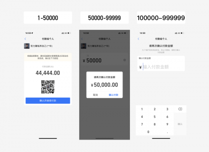 業務場景123主要應用金額輸入框組件,輸入框組件根據用戶操作行為,會有不一樣的設計,用戶沒有任何操作,輸入框內有默認文案提示“輸入付款金額”,用戶輸入金額后,計算單位超過‘百’,數字金額上方會有單位提示,同時顯示刪除按鈕,支持刪除,重新輸入,業務場景2中根據金額輸入范圍定義了產品業務規則,再細分出三種場景,不同范圍內的金額,可以對應的組件設計方案解決確認轉賬確認問題;