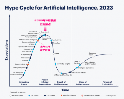 去年9月份,「Gartner」就預(yù)測(cè)生成式AI已經(jīng)進(jìn)入期望膨脹高位,到2023年8月「Gartner」剛發(fā)布人工智能技術(shù)成熟度曲線,生成式AI從技術(shù)萌芽期到技術(shù)膨脹期的頂峰,跟過(guò)去一段時(shí)間AI在學(xué)術(shù)、產(chǎn)業(yè)、資本領(lǐng)域的爆火完全呼應(yīng)。
