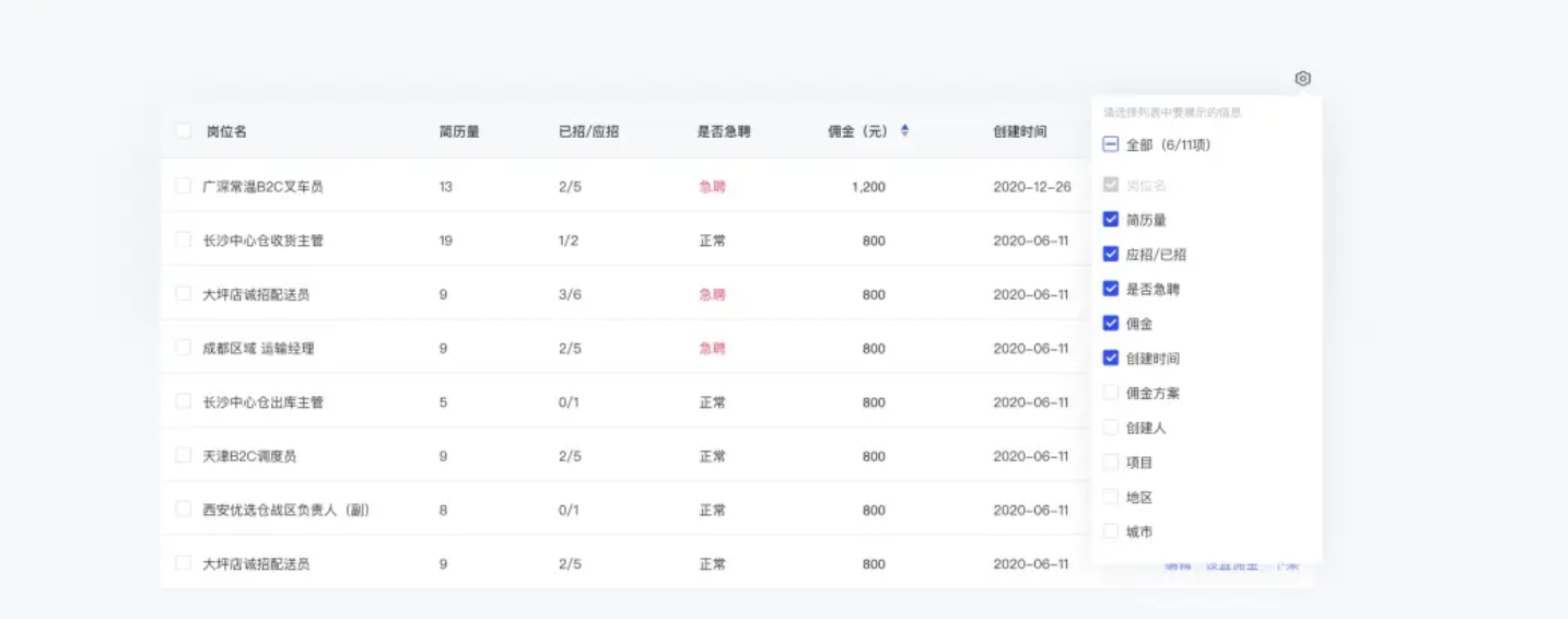 如果不同用戶想看到的信息側重不同,可以讓用戶自定義列的展示。在默認情況下僅展示最常用、最重要的幾個指標(如下圖)。這樣做的好處是:首先,用戶能在表格上方看到所有的指標名稱,避免了原來需要橫向拖拽才能瀏覽到所有指標的情況;其次,用戶可以根據自己的需要,自由的選擇顯示所需指標,隱藏不必要指標,減少干擾。但需注意系統應記住用戶上一次的自定義列設置,減少用戶重復操作。