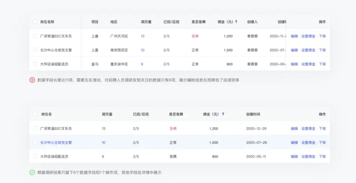 基于對實際業務需求、目標用戶訴求及其行為的理解,列數盡量控制在7±2,列舉用戶更為關注的數據,用戶需要的非重點、輔助性信息可以在詳情中展示。