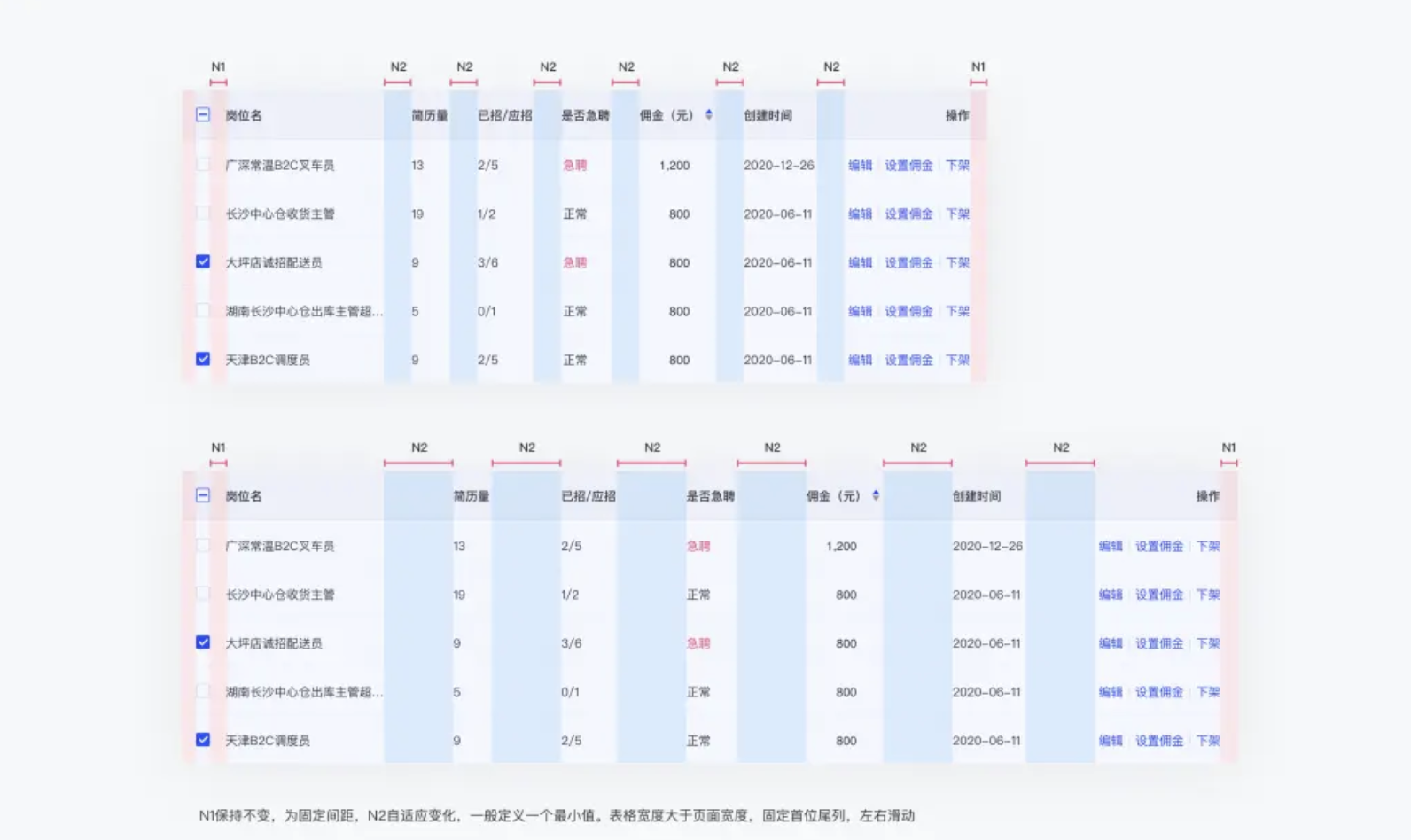 合適的填充和邊距對于視覺設計至關重要,以保證易讀性。定義列的間距時,我通常的做法是N1保持不變,將N2定義一個最小值,N2再根據表格的寬度自適應變化。表格主要適配到這個最小寬度,這一步驟通常的設計系統的初期就要完成,一方面可根據自己項目目前情況,按照導航寬度等固定尺寸確定最小的表格寬度,這樣在處理最小尺寸時,可以有一個明確的邊界,同時能與開發同學進行理解溝通。當表格寬度大于頁面寬度,固定首尾列,左右滑動。