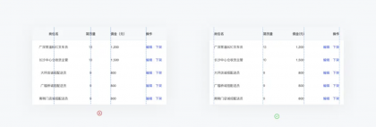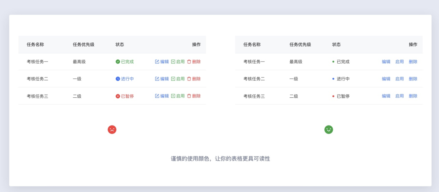 表格設計中一定不要使用過多的顏色區做狀態或操作的區分,過多的顏色細分會使表格變得更加混亂,影響用戶體驗。對狀態的區分,僅用輕量的顏色區分即可,操作欄保持主色按鈕色。