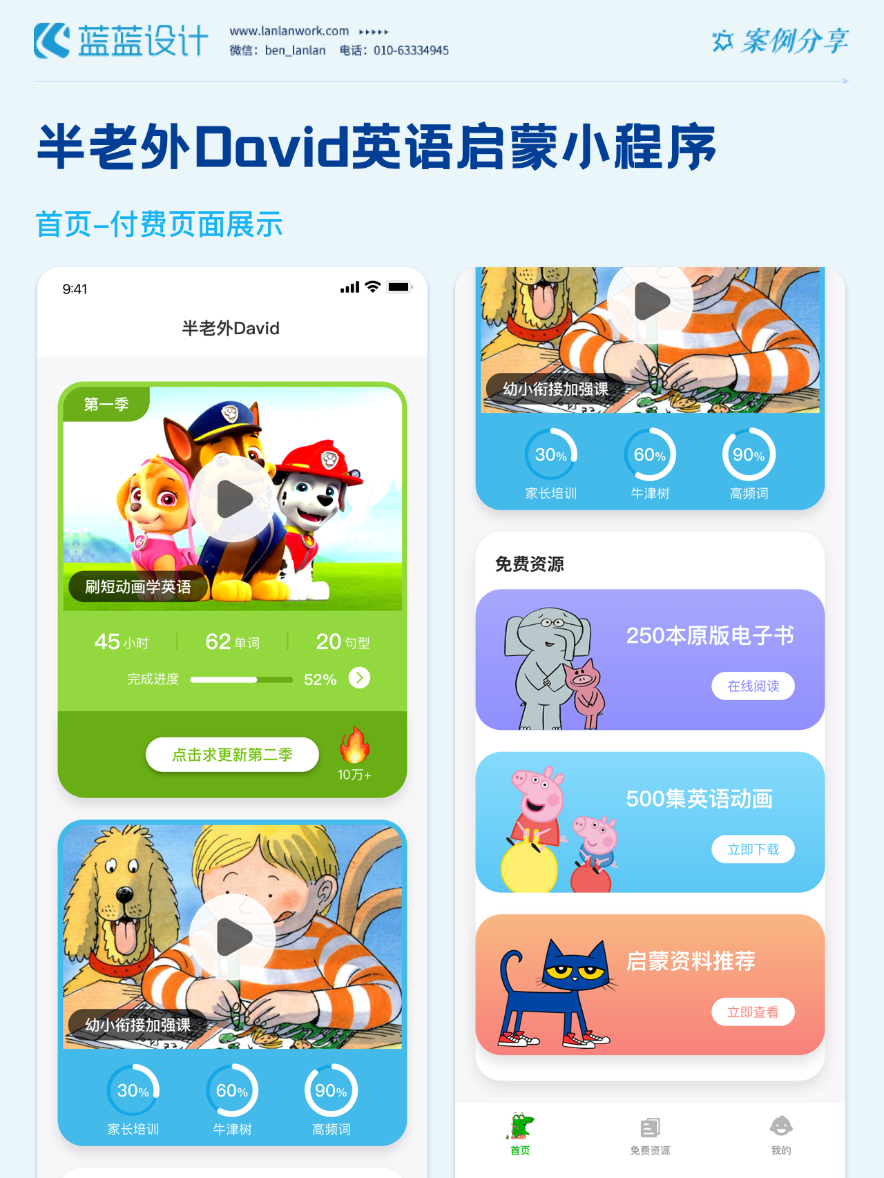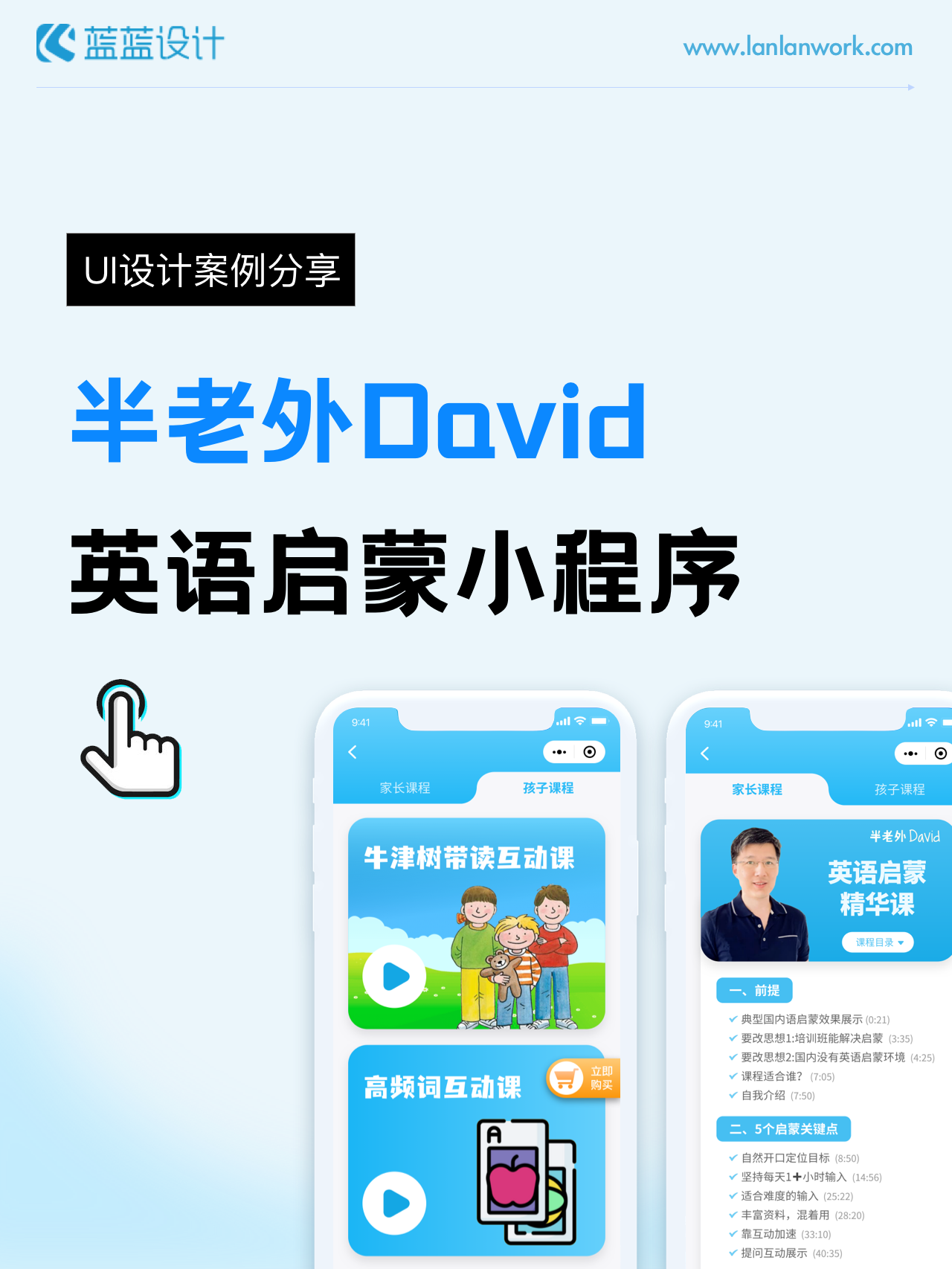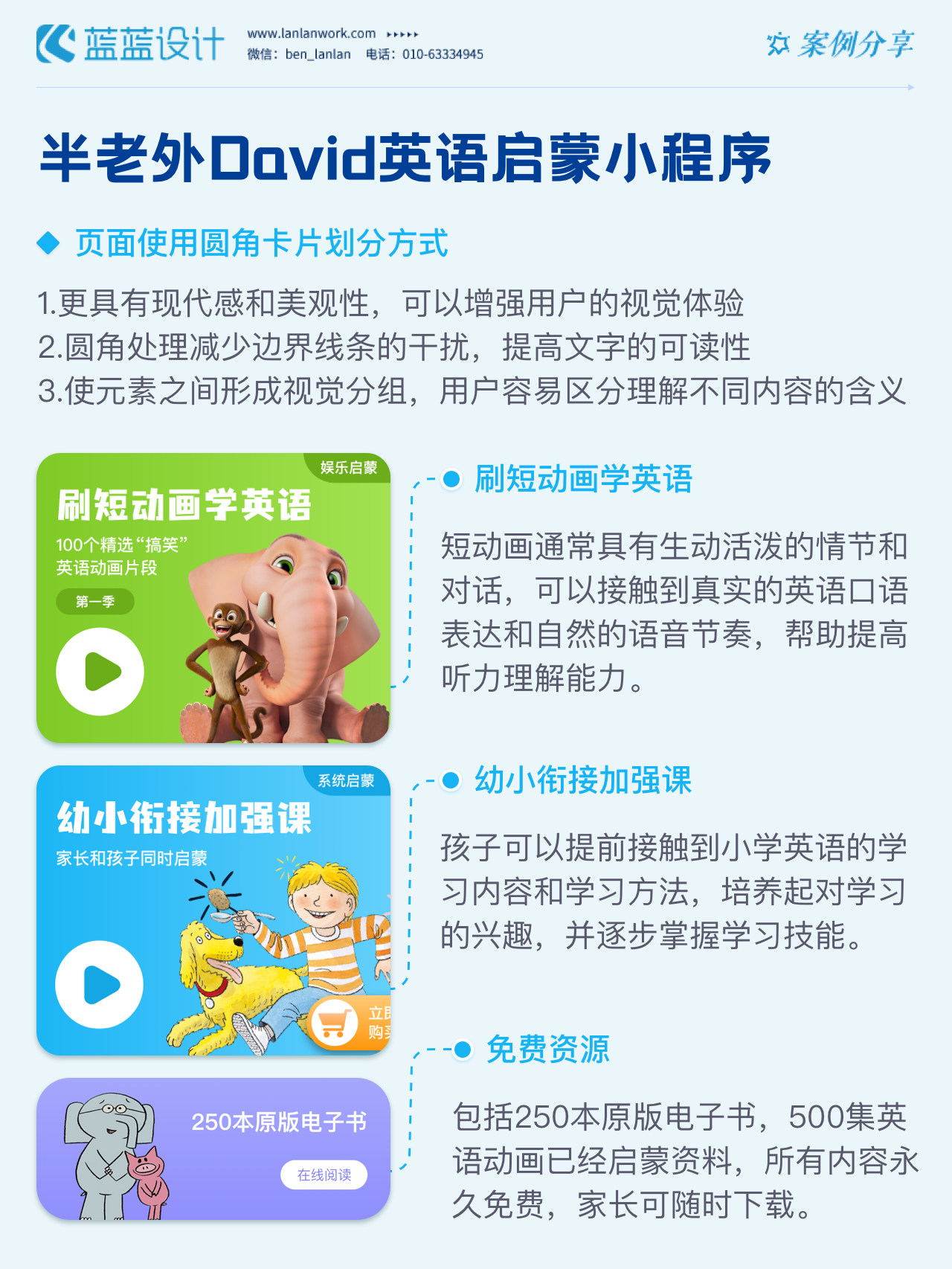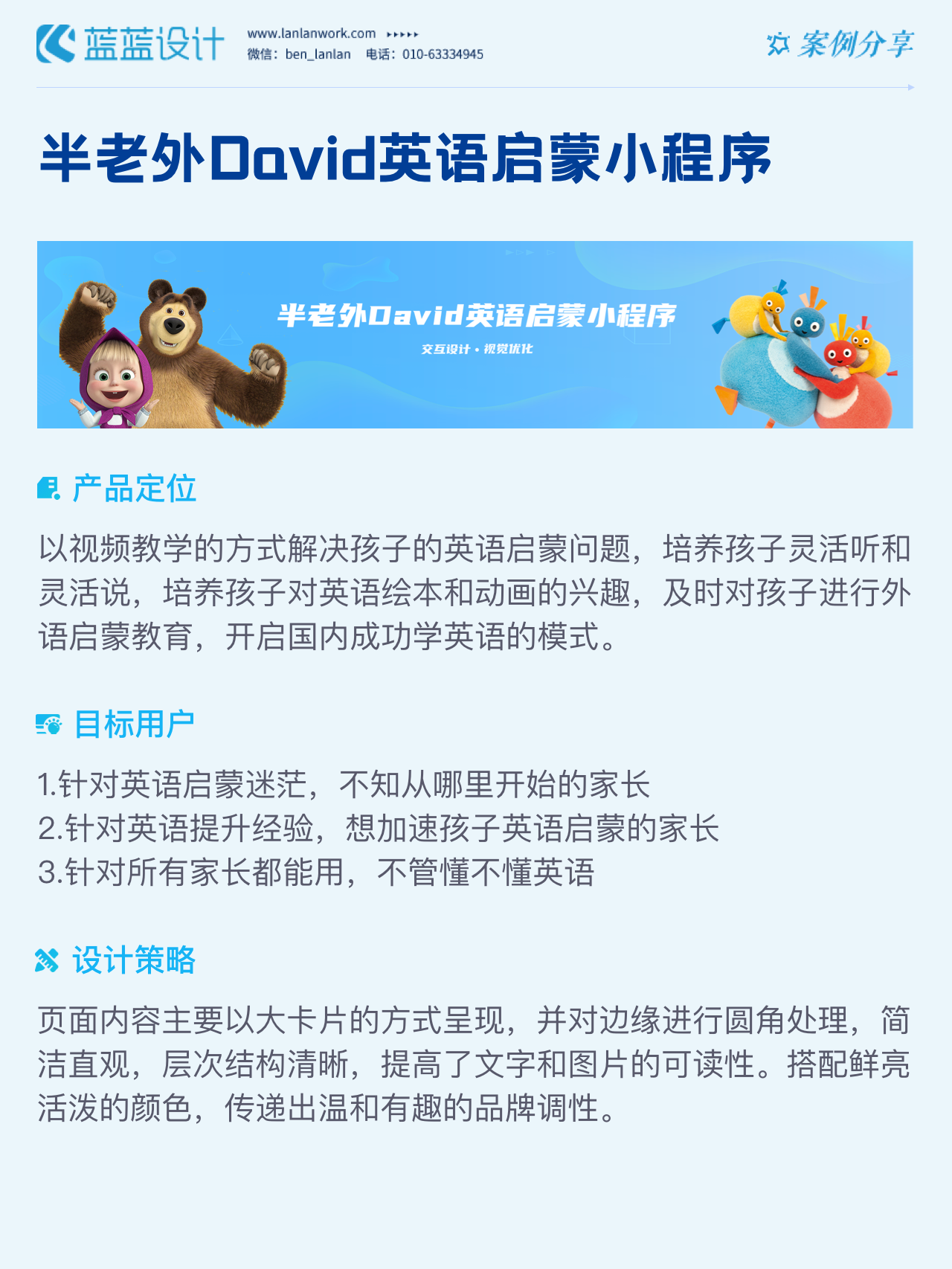 藍藍設計負責半老外David英語啟蒙小程序的界面整體風格和細節(jié)優(yōu)化工作,也包括圖片優(yōu)化等諸多視覺內容。前期雙方通過不斷溝通和深入了解最終確定了頁面的風格樣式??匆曨l學英語的方式更容易為孩子所接受,頁面的簡潔風格和顏色應用更加吸引兒童。