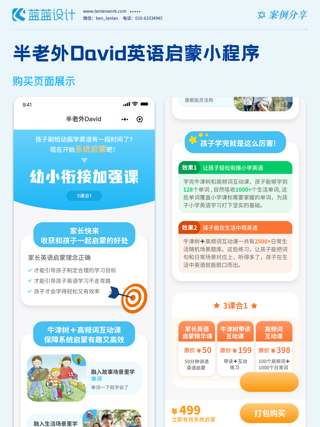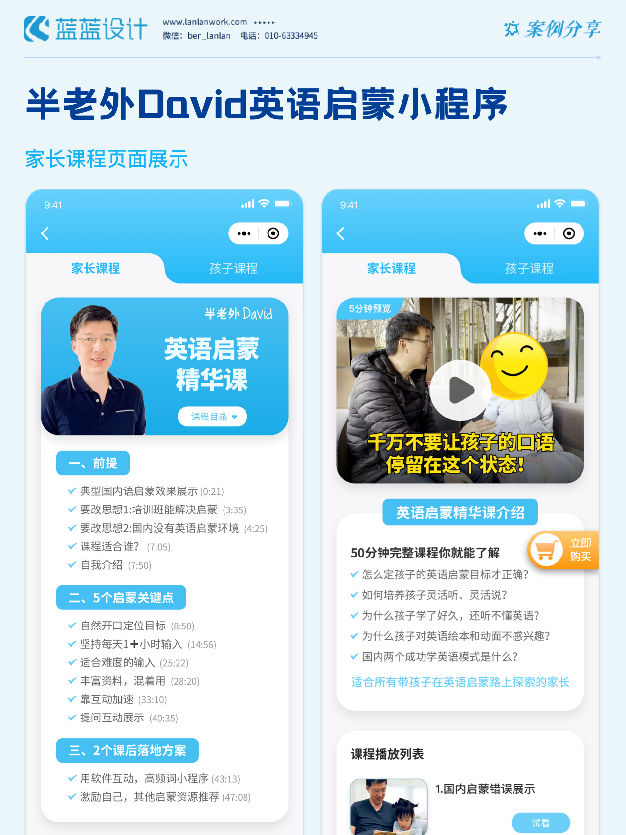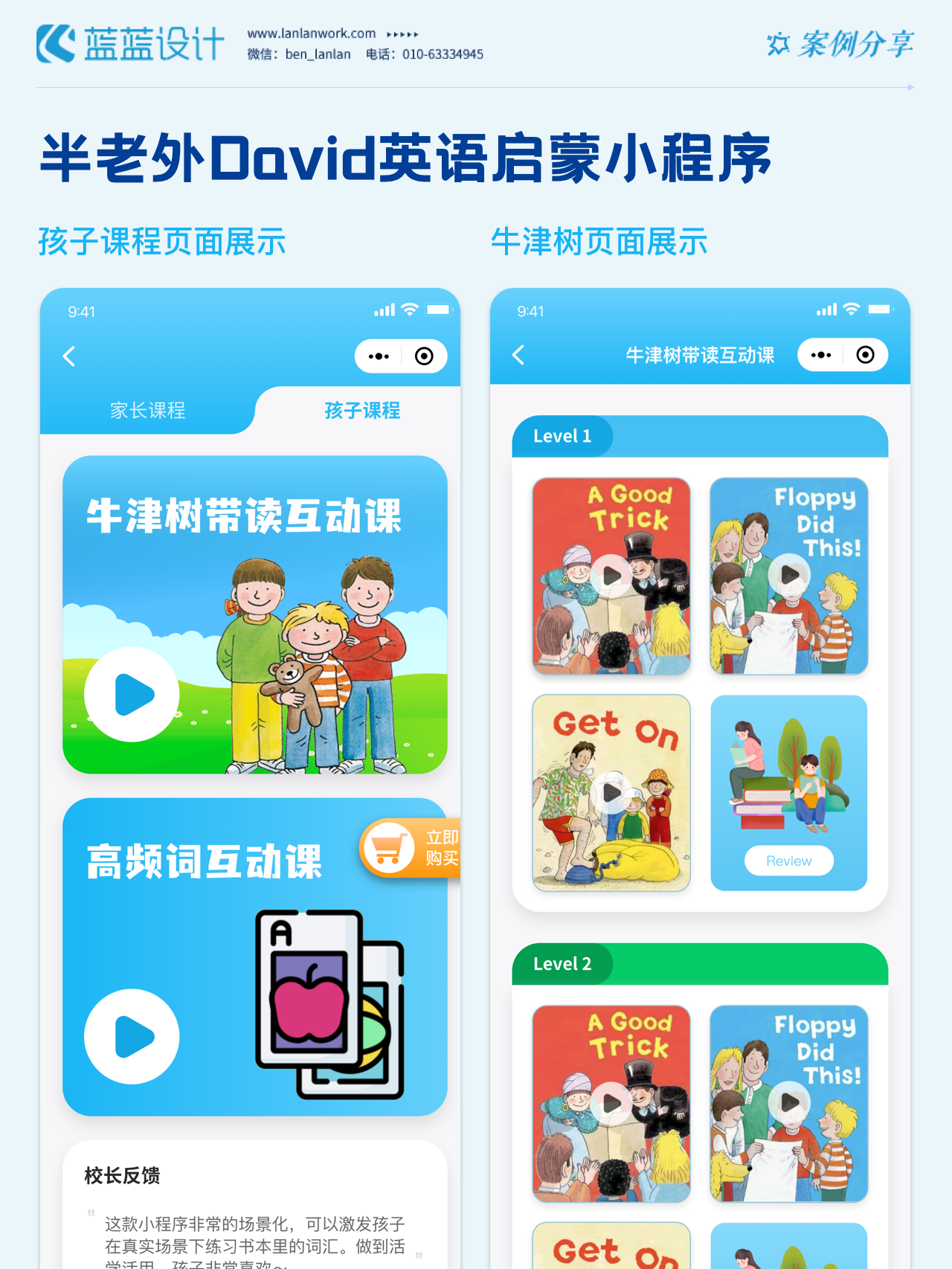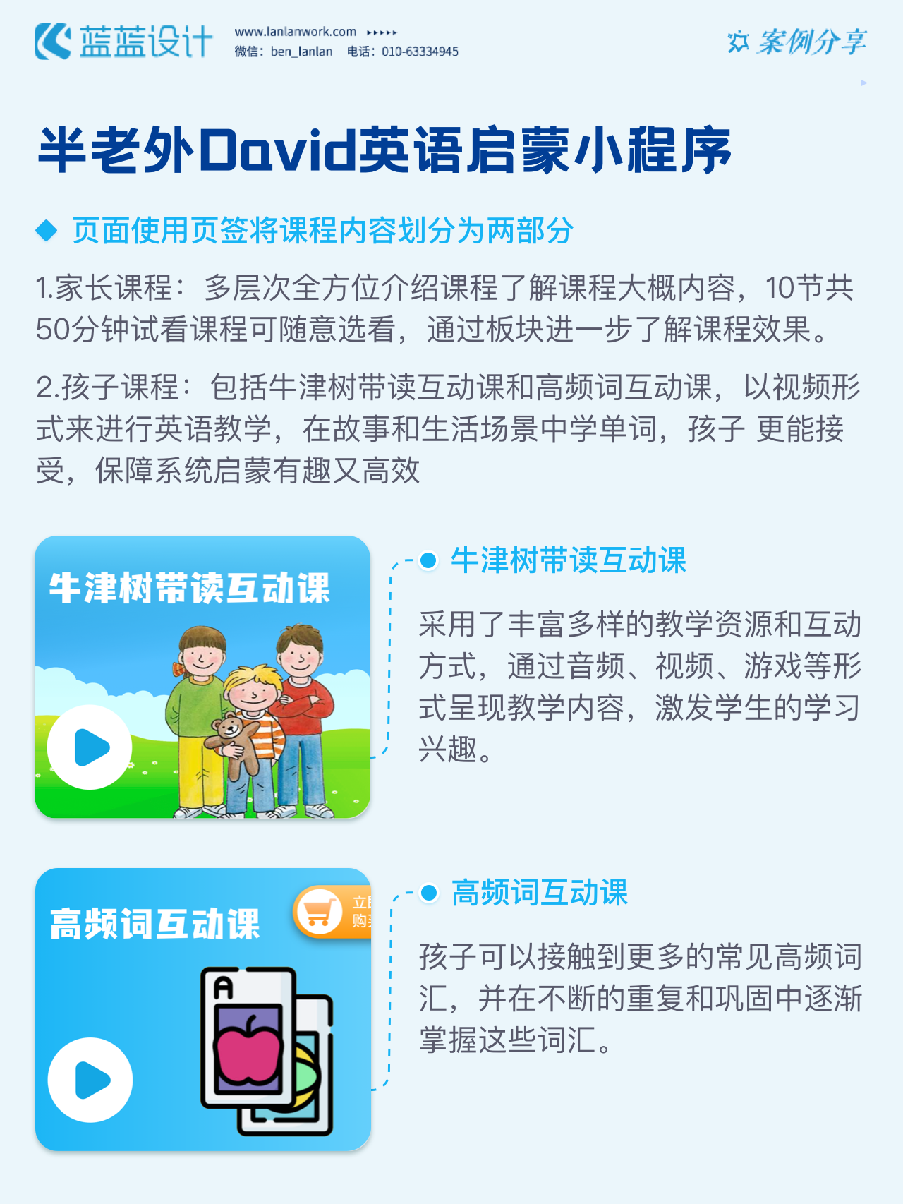 藍藍設計負責半老外David英語啟蒙小程序的界面整體風格和細節(jié)優(yōu)化工作,也包括圖片優(yōu)化等諸多視覺內容。前期雙方通過不斷溝通和深入了解最終確定了頁面的風格樣式??匆曨l學英語的方式更容易為孩子所接受,頁面的簡潔風格和顏色應用更加吸引兒童。