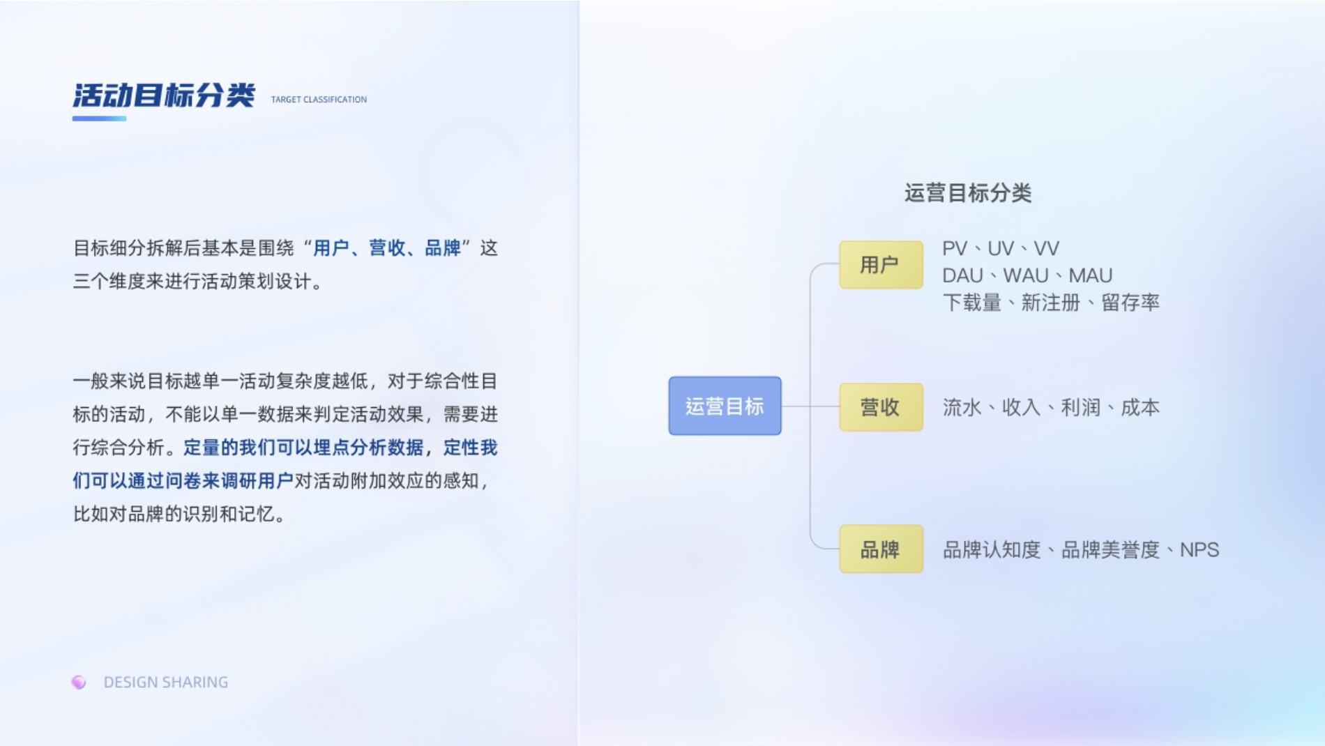 目標的細分拆解后,基本都是圍繞“用戶、營收、品牌”這三個維度來進行活動策劃設計。一般來說目標越單一活動復雜度越低,目標綜合性越高,越需要調動不同類型用戶參與,活動的復雜度就越高。對于綜合性目標的活動,不能以單一數據來判定活動效果,需要進行綜合分析。定量的我們可以埋點分析數據,定性我們可以通過問卷來調研用戶對活動附加效應的感知,比如對品牌的識別和記憶以及NPS(凈推薦值)。