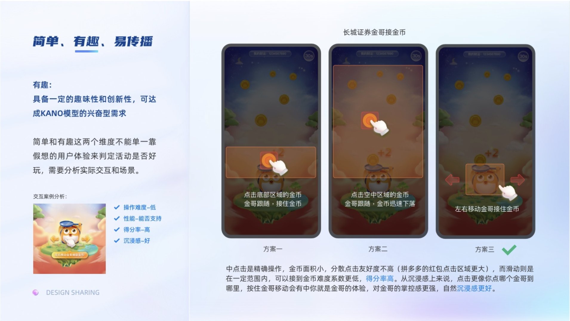 有趣:是指具備一定的趣味性和創新性,可達成KANO模型的興奮型需求。在設計過程中,簡單和有趣這兩個維度考慮不能單一靠假想的用戶體驗來判定活動是否好玩。比如在金哥接金幣游戲設計中,有一個交互手勢是金哥如何接金幣。手勢鎖定在底部點擊,全局點擊,左右滑動。其實按照ui慣性的思維,底部點擊成本低于全部點擊低于左右滑動,所以一開始是建議使用的是底部點擊。但是后面進行測試發現,左右滑動的趣味性遠大于點擊,且執行成本也比較低。主要是在游戲過程中點擊是精確的操作,由于金幣的數量多,且面積小,分散點擊友好度不高(拼多多的紅包點擊區域更大),而滑動則是在一定范圍內,金哥用平底鍋區域可以接到金幣難度系數更低,得分率高。從沉浸感上來說,點擊更像你點哪個金哥到哪里,按住金哥移動會有中你就是金哥的體驗,對金哥的掌控感更強,自然沉浸感也更好。