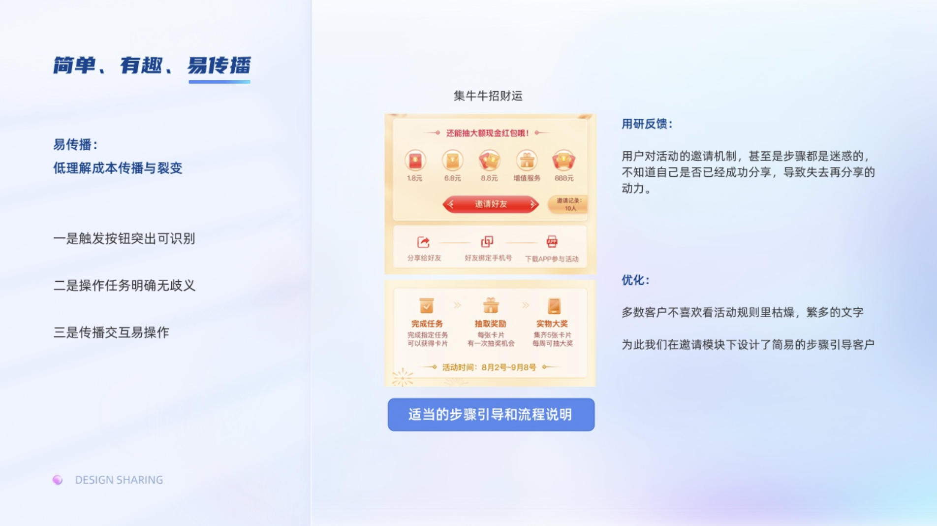 易傳播:是指低理解成本傳播與裂變。一是觸發按鈕突出可識別;二是操作任務明確無歧義;三是傳播交互易操作。通常我們設計的時候會理所當然感覺用戶是很明確他們的操作行為的,但是基于某證券一期的活動用研反饋,用戶對活動的邀請機制,甚至是步驟都是迷惑的,不知道自己是否已經成功分享,導致失去再分享的動力,為此我們在邀請模塊下設計了簡易的步驟去引導客戶。