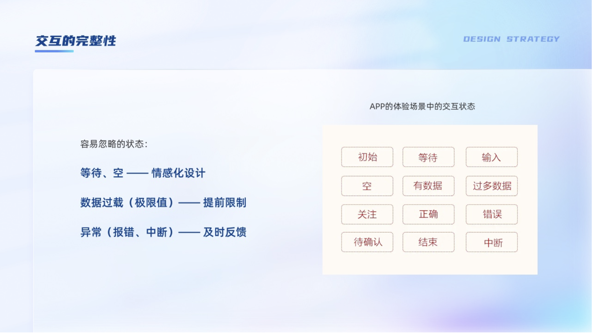 交互狀態都要考慮全面,如登錄前后狀態,空狀態,各個等級的狀態,任務前后的狀態,不同類別用戶的狀態等。