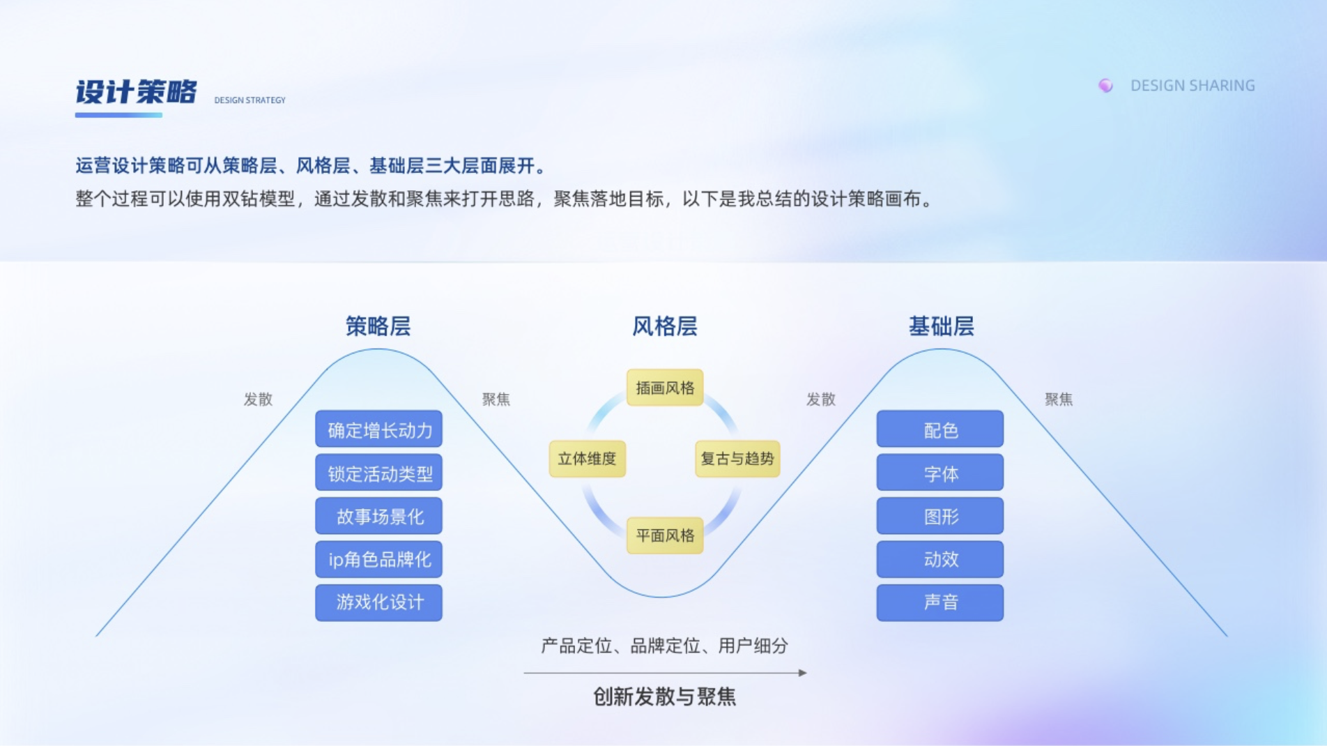 運營設計策略可從策略層、風格層、基礎層三大層面展開。整個過程可以使用雙鉆模型,通過發散和聚焦來打開思路,聚焦落地目標,以下是我總結的設計策略畫布。