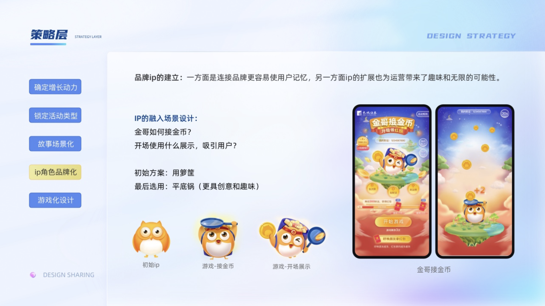 現在幾乎每個產品都有自己的ip,一方面是連接品牌更容易使用戶記憶,另一方面ip的擴展也為運營帶來了趣味和無限的可能性。ip的使用一是要保證ip的識別性,另一方便是需要很好的融入我們的故事場景。比如金哥他出現在我們接金幣的場景需要什么樣的裝束,使用什么動作更好的連接到這個接金幣的故事場景中。一開始想著用籮筐去接金幣,但是籮筐體積大而高,會擋住ip,降低了ip的識別度。在設計的過程中突然靈光一閃,為了什么不用平底鍋呢,它除了打人,接金幣也不錯。通過金哥頭頂平底鍋的接金幣方式,增添了整個游戲的創新性和趣味性,至于籮筐可以收納平底鍋接到的金幣,整個場景就很有邏輯性和畫面感了。同時為了凸顯游戲的氛圍,還給ip設計了頭帶必勝的綁帶的小細節,和有沖擊力的動作,增添了ip的生命力。