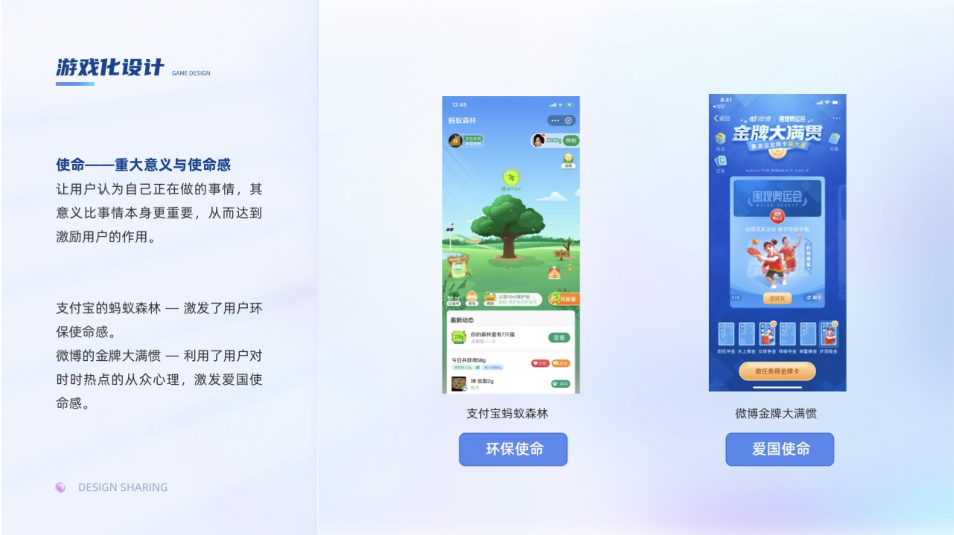 讓用戶認為自己正在做的事情,其意義比事情本身更重要,從而達到激勵用戶的作用。譬如支付寶里面的螞蟻森林,種的不是樹,而是地球的一點綠,這個使命感瞬間油然而生,在玩的過程中還能幫助地球綠化,激發了用戶環保使命感。再比如在奧運期間的微博的金牌大滿慣的活動,以圍觀奧運會之名,集奧運金牌卡喊你助威中國,利用了用戶對時時熱點的從眾心理,又聯系到了愛國上升了到了愛國使命感。