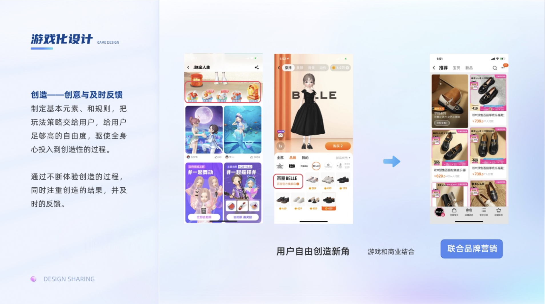 制定基本元素、和規則,把玩法策略交給用戶,給用戶足夠高的自由度,驅使全身心投入到創造性的過程。通過不斷體驗創造的過程,同時注重創造的結果,并及時的反饋。比如淘寶人生,可以打造自己的形實質上就是裝扮類的游戲,這種常駐型的游戲,不僅可以提高用戶使用產品的時長,還可以聯動品牌做營銷提高下單率。其生命力的不竭動力就源于,對用戶不斷提供創新的服裝、妝容、飾品、場景,讓用戶自由創造新角。