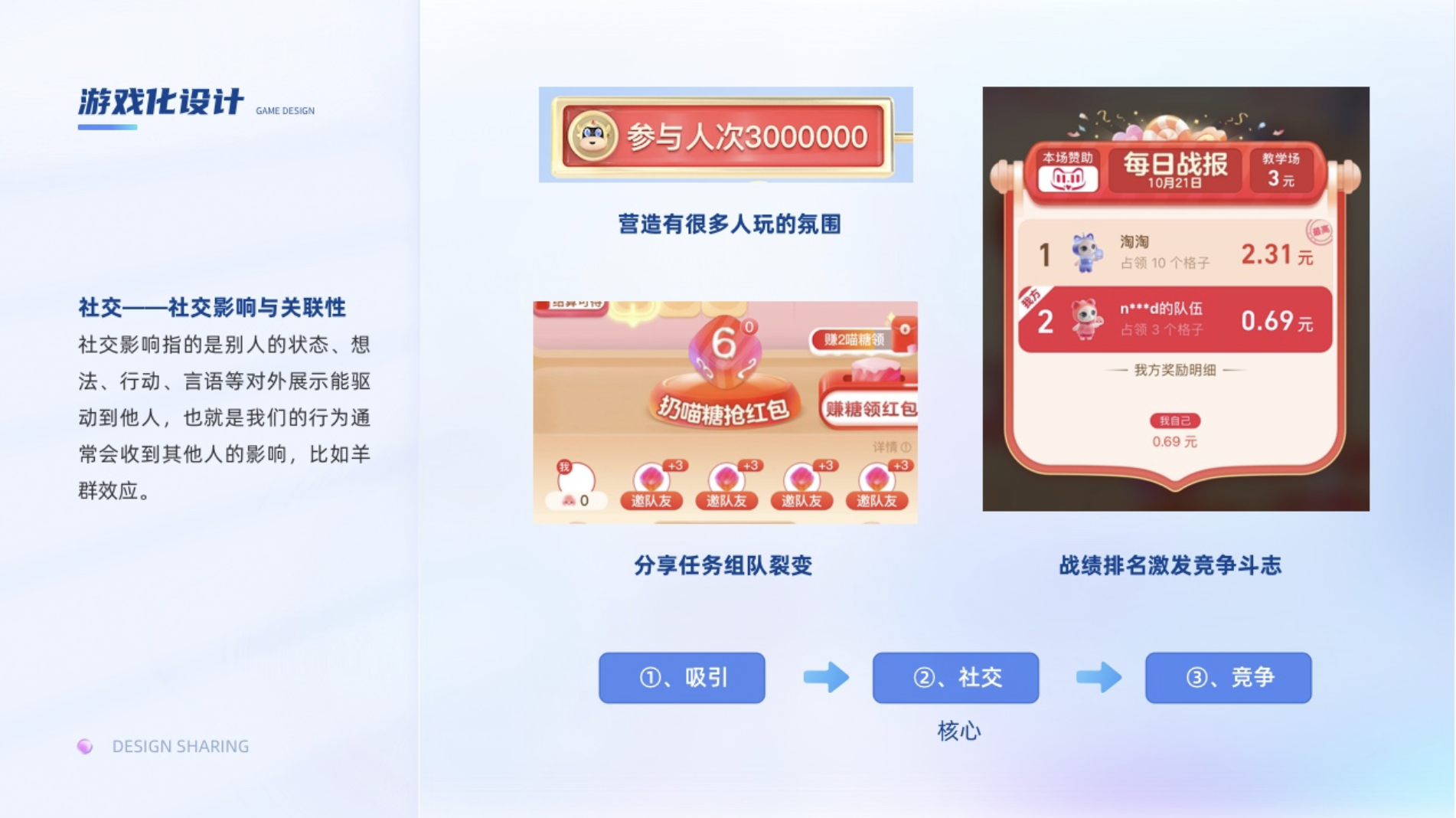 社交影響指的是別人的狀態、想法、行動、言語等對外展示能驅動到他人,也就是我們的行為通常會收到其他人的影響,比如羊群效應。就像看抖音,點贊量多的,沒準我們會跟有耐心看到最后,因為有個潛意識心理就是大家都覺得好,總之差不到哪里去。在游戲和運營活動中,營造有很多人玩的氛圍,鼓勵用戶炫耀自己的成果都是非常見效的方式。關聯性我理解為我們會選擇盡可能與我們有關聯的事物。比如拼多多推薦你去分享,都是優先推薦與你互動最為頻繁的,這樣去拼單和拼單成功的幾率更高。