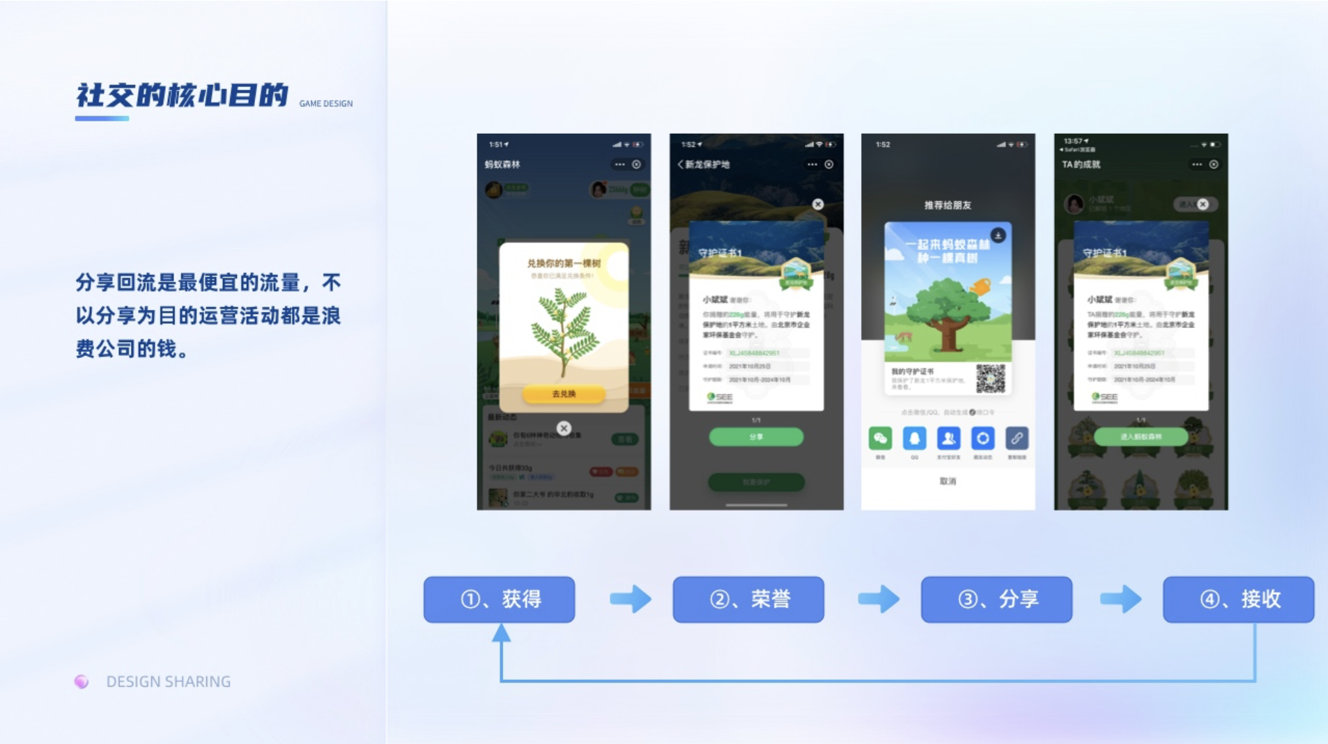 指參與過程中取得進步、獲得技能、獲得榮譽,從而獲得成就感,去克服困難達成目標。一般我們會通過證書,勛章,排行榜等去給與用戶成就獎勵。挑戰和技能是促使用戶不斷升級的主要因素,為了讓用戶沉浸其中護住心流,適當的挑戰難度和技能解鎖就顯得尤為重要。挑戰難度高了容易引起用戶的焦慮,難度低了又會讓用戶感覺無聊。比如集卡行動,在考慮總預算不變的情況下,如何設置稀有卡的比例,集卡的難度就尤為重要。支付寶集五福在初期,敬業福的比例比較低,所以用戶抽到敬業福的體驗就很開心,但隨著支付寶后面為了擴大社交屬性,提高了集齊率,集五到五福的興奮感就弱了,導致部分用戶失去動力,因為集到的人越多后續瓜分的錢就越少。