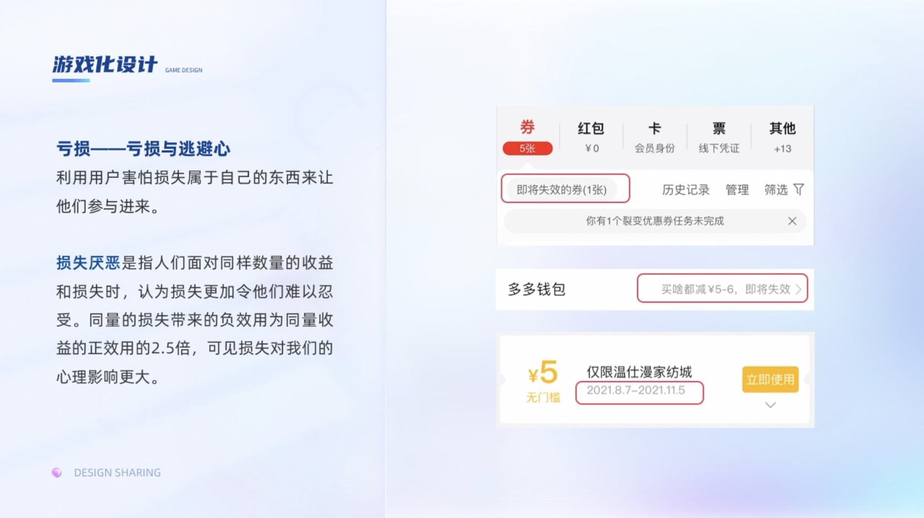 利用用戶害怕損失屬于自己的東西來讓他們參與進來。可以結合損失厭惡來理解。損失厭惡是指人們面對同樣數量的收益和損失時,認為損失更加令他們難以忍受。同量的損失帶來的負效用為同量收益的正效用的2.5倍,可見損失對我們的心理影響更大。比如商家發給你的免費優惠券,其實你本身不需要購買什么,但是商家偏偏在優惠券上加上時效性,超過活動日期就置灰了,即使你原本沒有購買需求,但是感覺沒用掉優惠券就像損失了優惠券的錢一樣,就會去購買,甚至為了湊單購買更多東西。