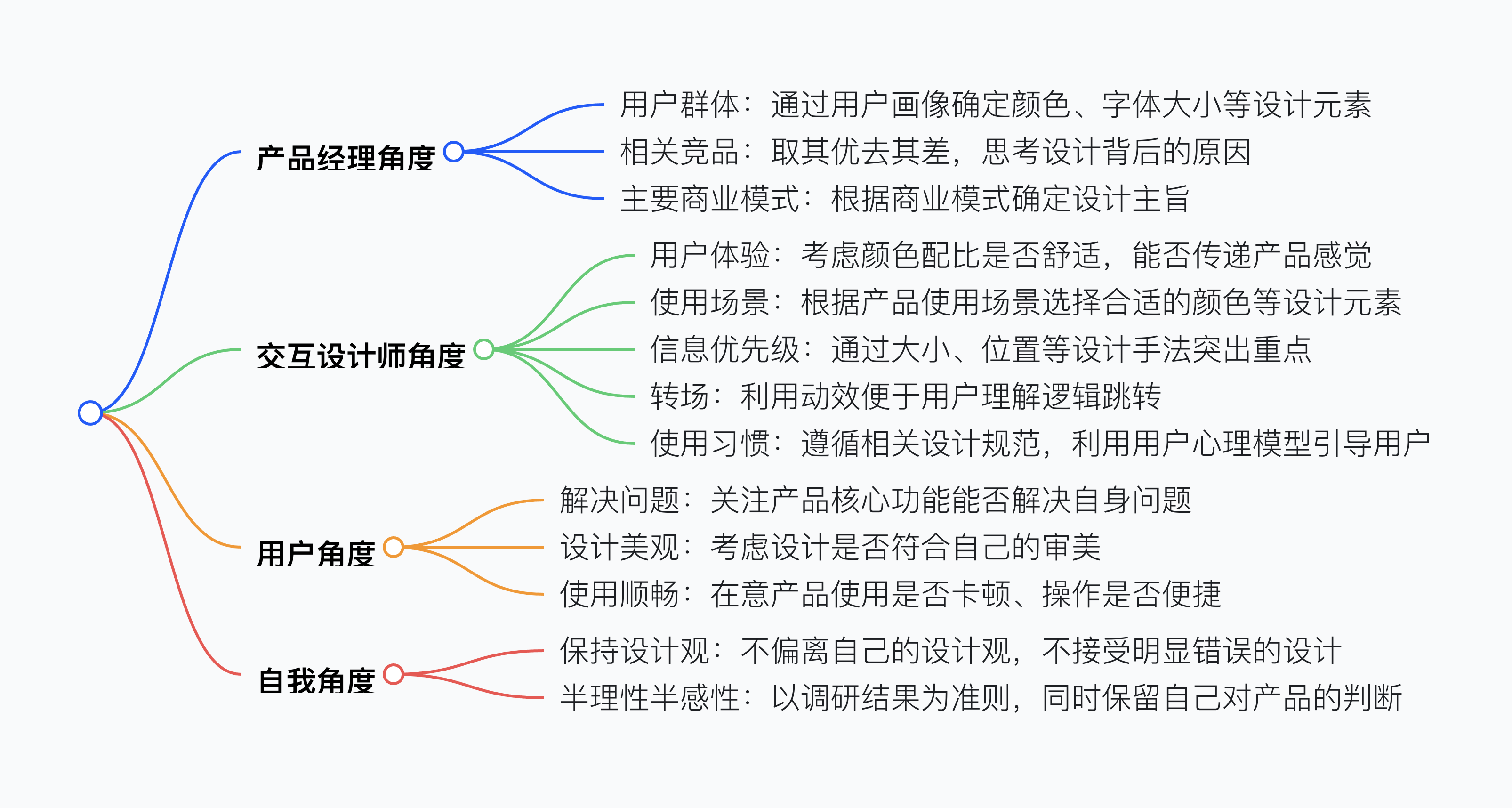 UI 設計需從產品經理、交互設計師、用戶和自我這 4 個角度思考:像產品經理一樣關注用戶群體、相關競品、主要商業模式;像交互設計師一樣考慮用戶體驗、使用場景、信息優先級、轉場、使用習慣;像用戶一樣思考產品能否解決問題、設計是否美觀、使用是否順暢;像自己一樣保持設計觀,不盲目接受錯誤設計。如此才能做出符合用戶需求且有自己韻味的設計。