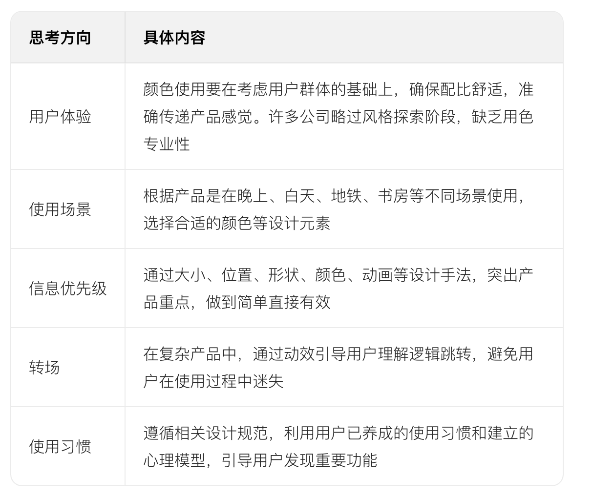 • 答案:交互設計師角度的思考包括用戶體驗、使用場景、信息優先級、轉場、使用習慣等方面。在用戶體驗上,影響顏色配比的舒適性和對產品感覺的傳遞;在使用場景上,決定設計元素是否符合產品使用環境;在信息優先級上,指導如何通過設計手法突出重點;在轉場上,幫助用戶理解邏輯跳轉;在使用習慣上,利用用戶心理模型引導操作,這些都能提升 UI 設計的實用性和用戶體驗。