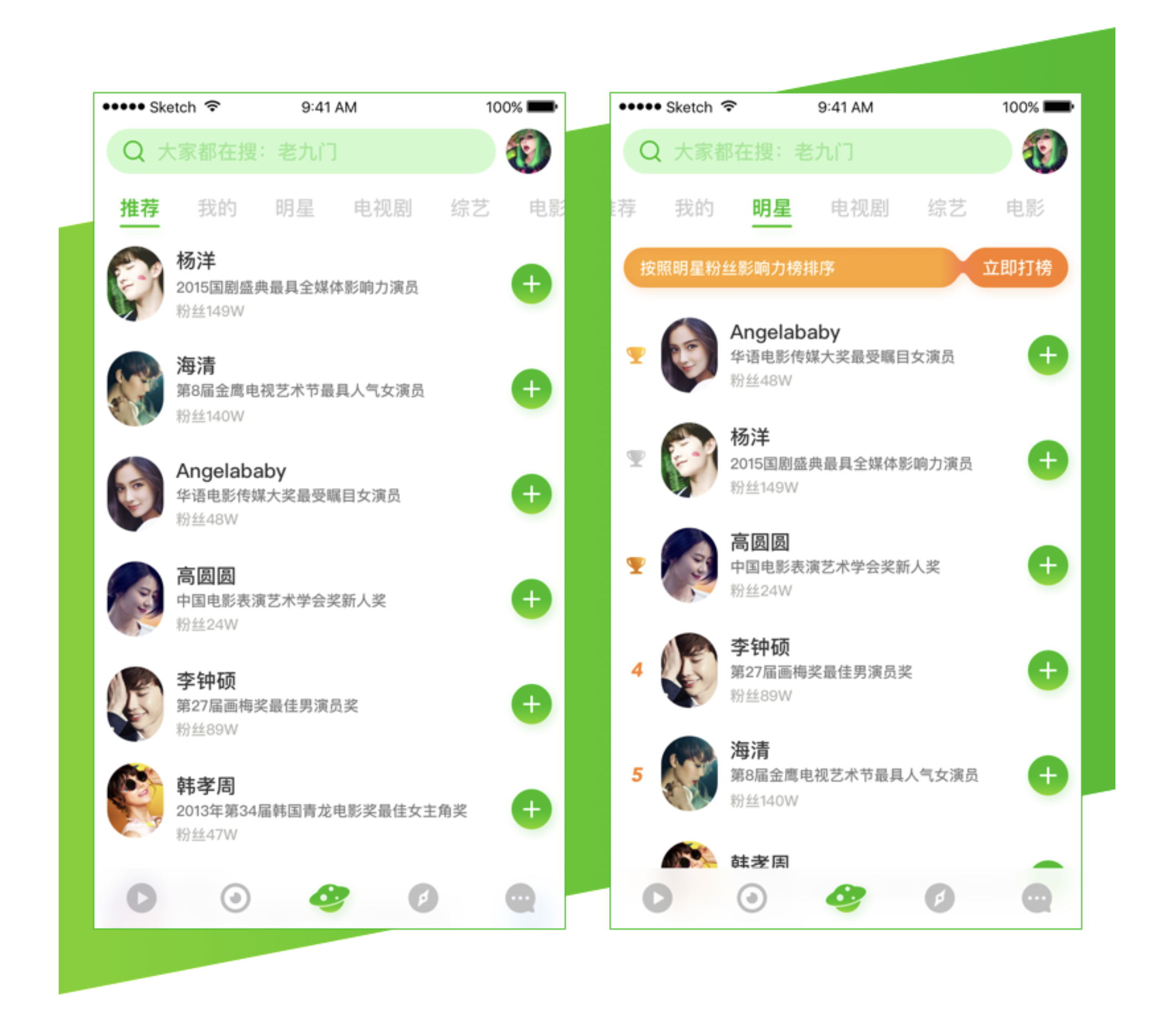 • 信息展示:明星圈簡介字段保留,布局與推薦頁一致;明星標簽頁將排序信息放列表左側,不外露影響力分值等與排名相關信息,營造榜單氛圍。