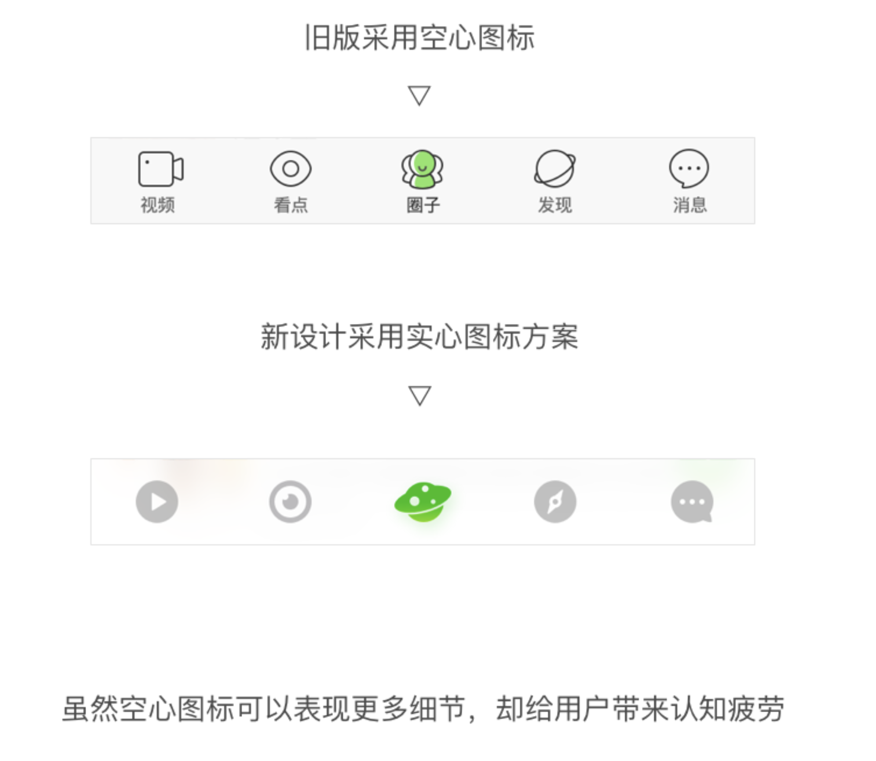 • 圖標選擇:采用實心圖標,依據國外設計師 Aubrey Johnson 的 25000 個圖標識別實驗,實心圖標更符合大眾審美且識別速度更快,如手機 QQ 和 Apple Music 也改用實心圖標。