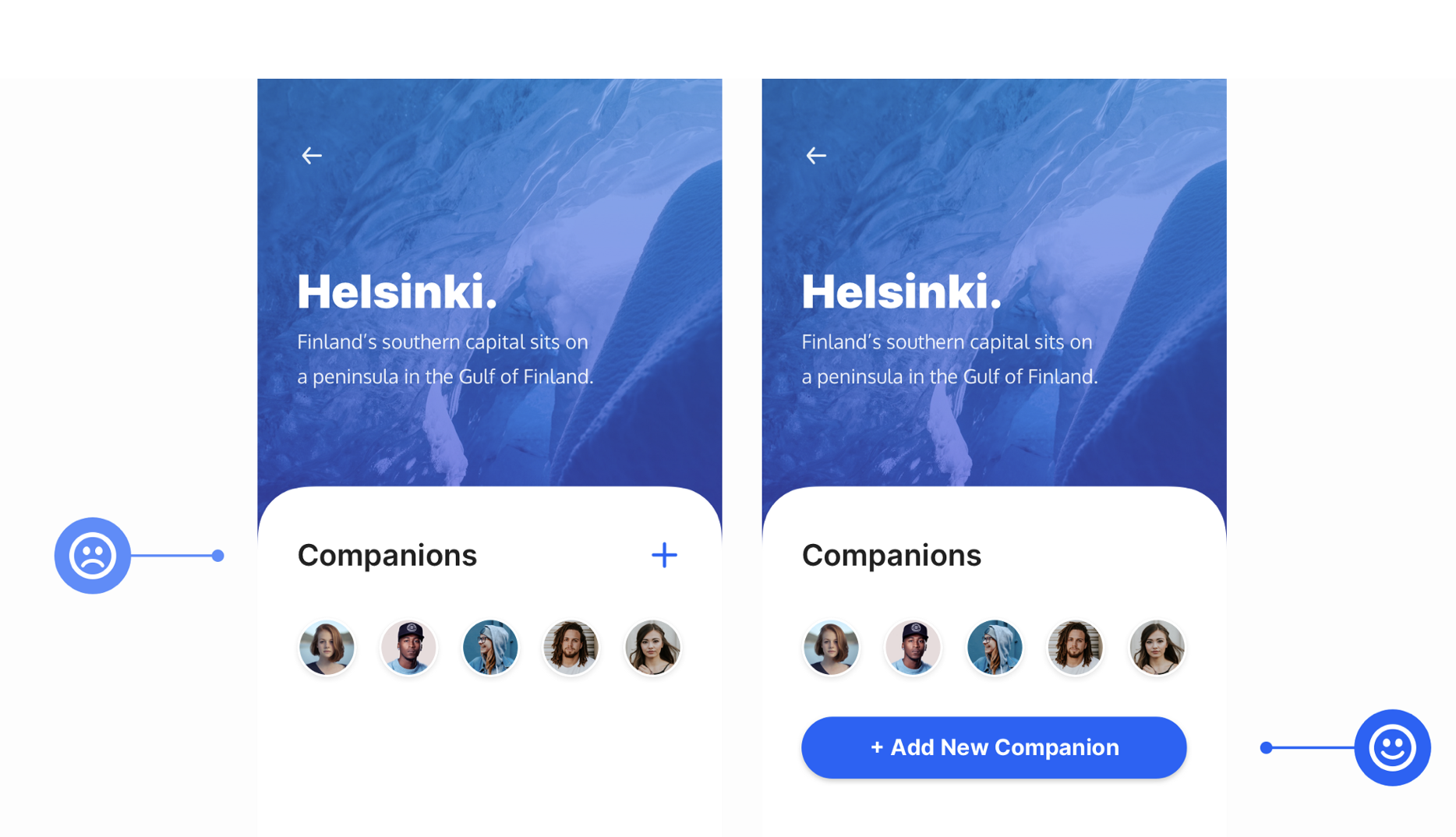 • 突出 “行為召喚”:“行為召喚” 即通過設計提示用戶觸發按鈕、文本或圖片等行為。設計時,需通過顏色對比、尺寸和標簽等方式,確保其在屏幕上處于最突出的位置。若條件允許,不要僅依賴圖標,搭配文本標簽能讓用戶更好地理解。