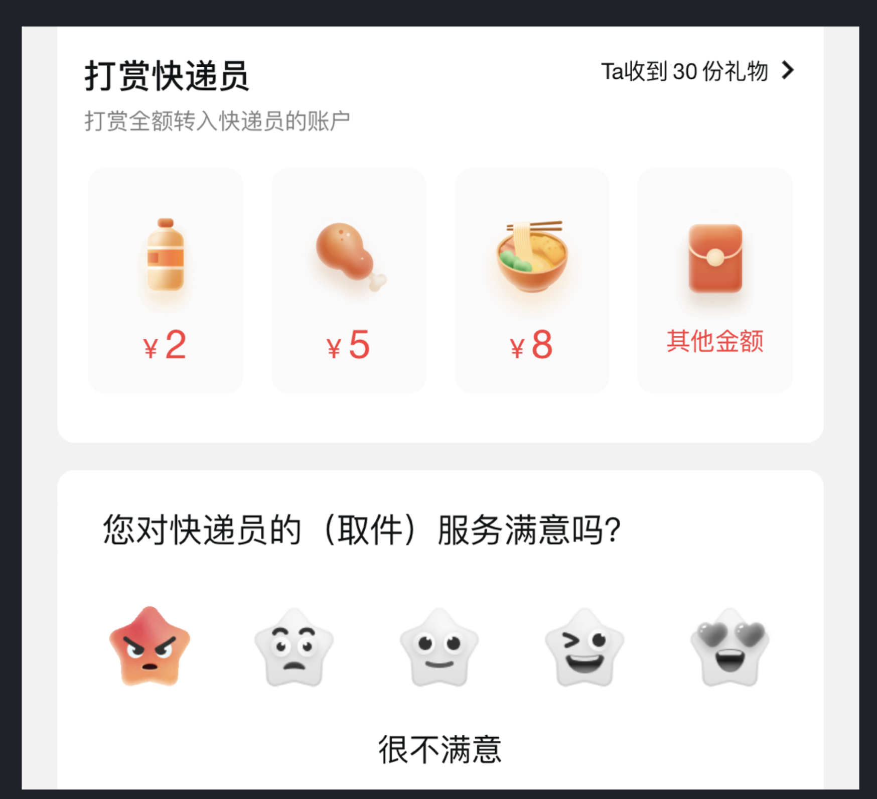 順豐速運在用戶完成快遞服務后,通過打賞功能和滿意度評價環節,用直觀的表情圖標體現不同滿意度等級(很不滿意、不滿意、一般、滿意、非常滿意),并搭配具體評價選項,既形象傳遞信息,又提升了用戶參與度。