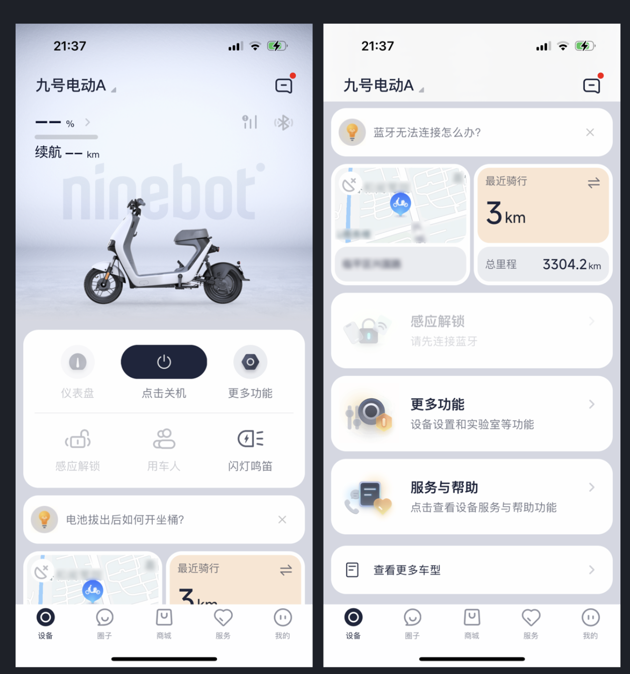 九號出行 App 體現了 Bento UI 設計趨勢,界面如便當盒般有清晰區塊劃分,功能區分明確,整體整齊美觀,富有層次感、現代感。