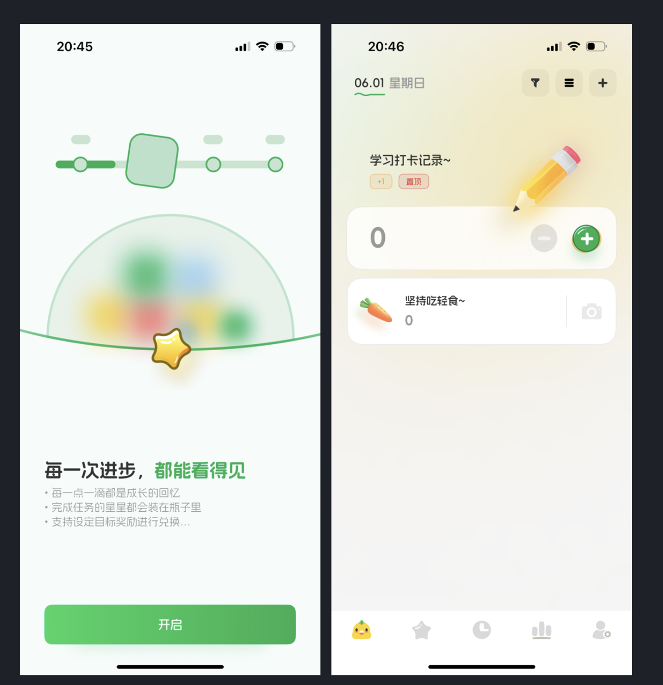 “星習慣” App 集習慣養成、學習打卡、生活記錄等功能于一體,其 UI 設計區別于大眾化風格,符合年輕用戶審美,交互邏輯也值得學習,用戶可通過完成任務收集 “星星”,還能設置目標獎勵等。
