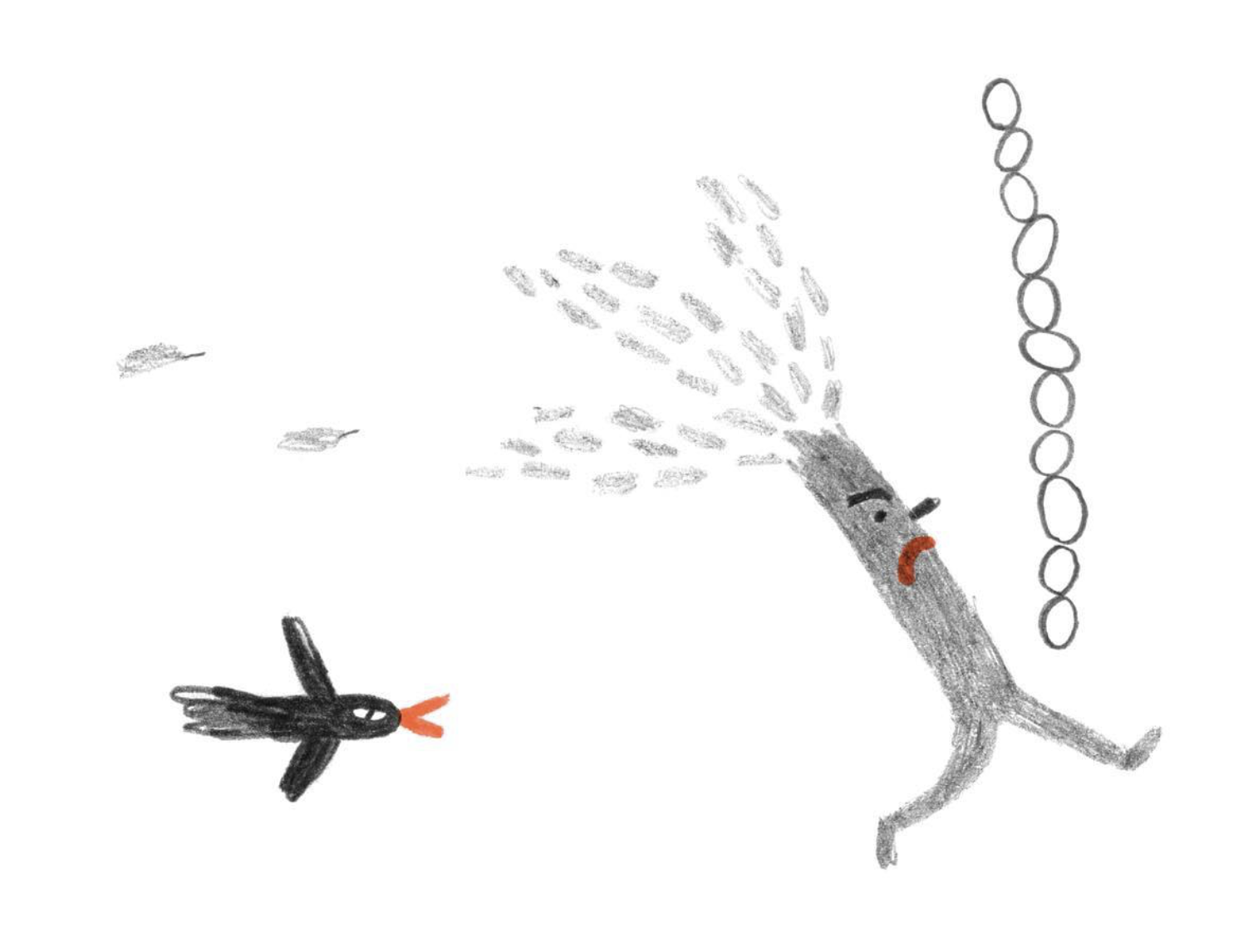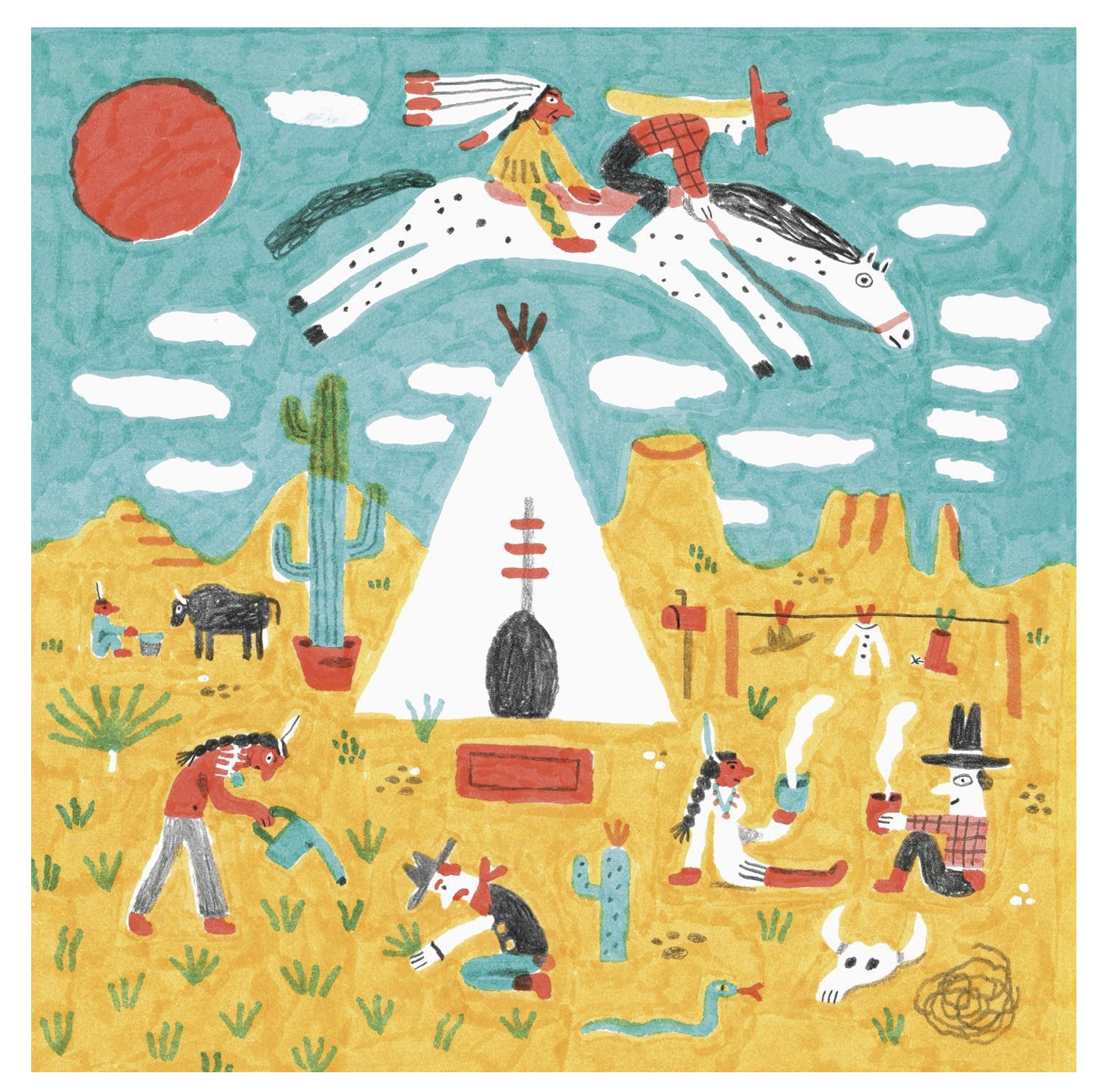 Andrea 的畫,第一眼就帶著 “不刻意的可愛”。他從不用規整的線條框定形象,反倒偏愛孩童般的 “稚拙感”:歪歪扭扭的動物輪廓、不對稱的眼睛、翹得老高的嘴角,連植物的枝葉都像剛被風吹得晃了晃 —— 比如那只圓滾滾的小熊,頂著歪歪的條紋帽子,爪子搭在蜂蜜罐上,明明線條簡單到像隨手畫的草稿,卻讓人一眼就被它的憨態逗笑。這種 “反精致” 的風格,恰恰打破了成人世界對 “完美” 的執念,就像小時候我們趴在桌上涂畫時,從不在意線條是否筆直,只在乎筆下的角色是否 “有趣”。