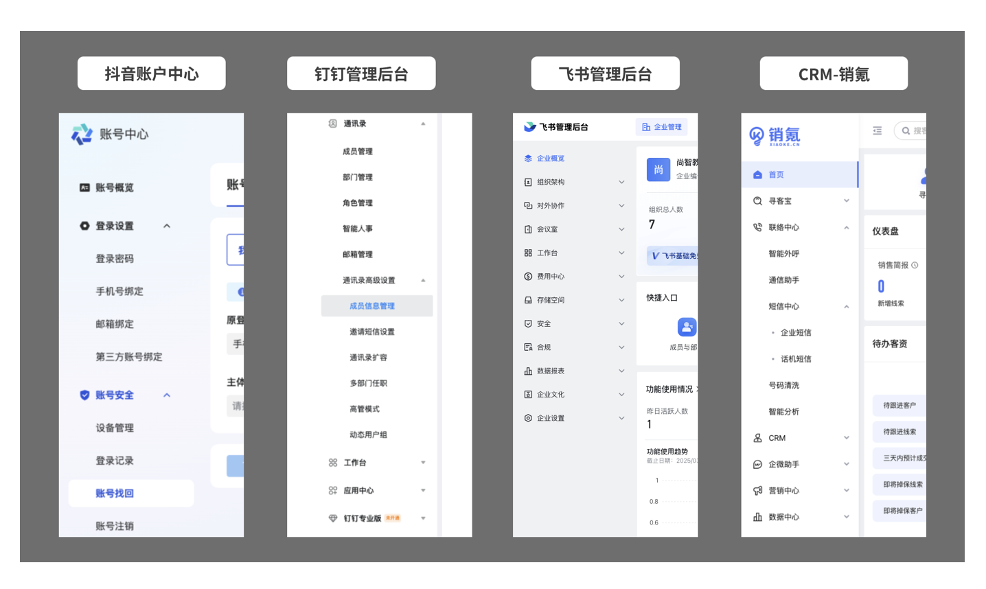 - 寬欄(混合導航):圖標與文字并存,支持多級菜單嵌套,是最常見的側邊欄樣式。通過分組標題和分割線提升信息密度,兼容性強,適合業務復雜、功能模塊較多的系統,如抖音賬戶中心、飛書管理后臺、釘釘管理后臺等。