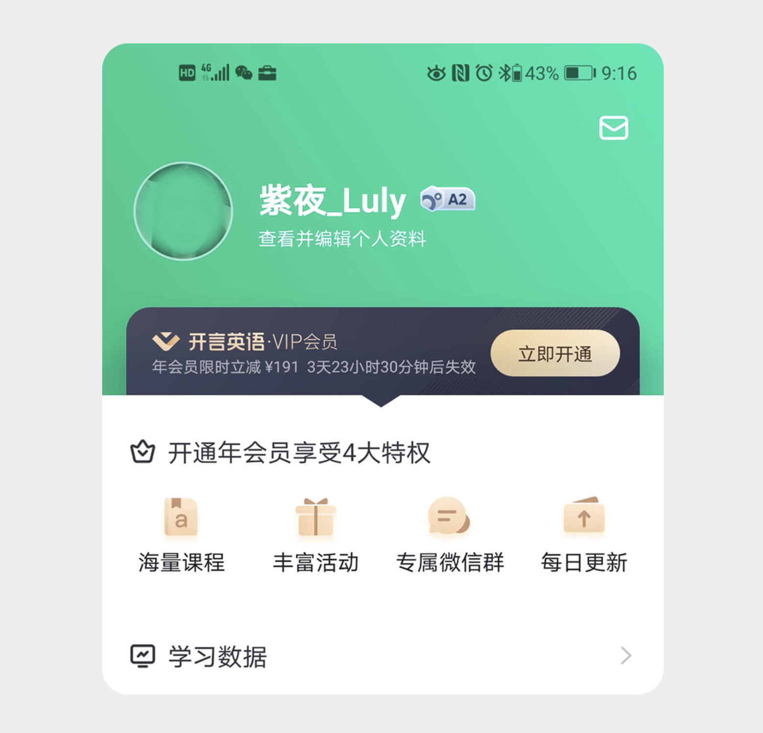 開(kāi)言英語(yǔ)的 VIP 會(huì)員開(kāi)通頁(yè)面,以簡(jiǎn)潔有力的形式感突出核心價(jià)值。頁(yè)面聚焦 “年會(huì)員限時(shí)立減” 的優(yōu)惠信息,用醒目字體強(qiáng)調(diào)折扣力度和時(shí)效,瞬間抓住用戶注意力。