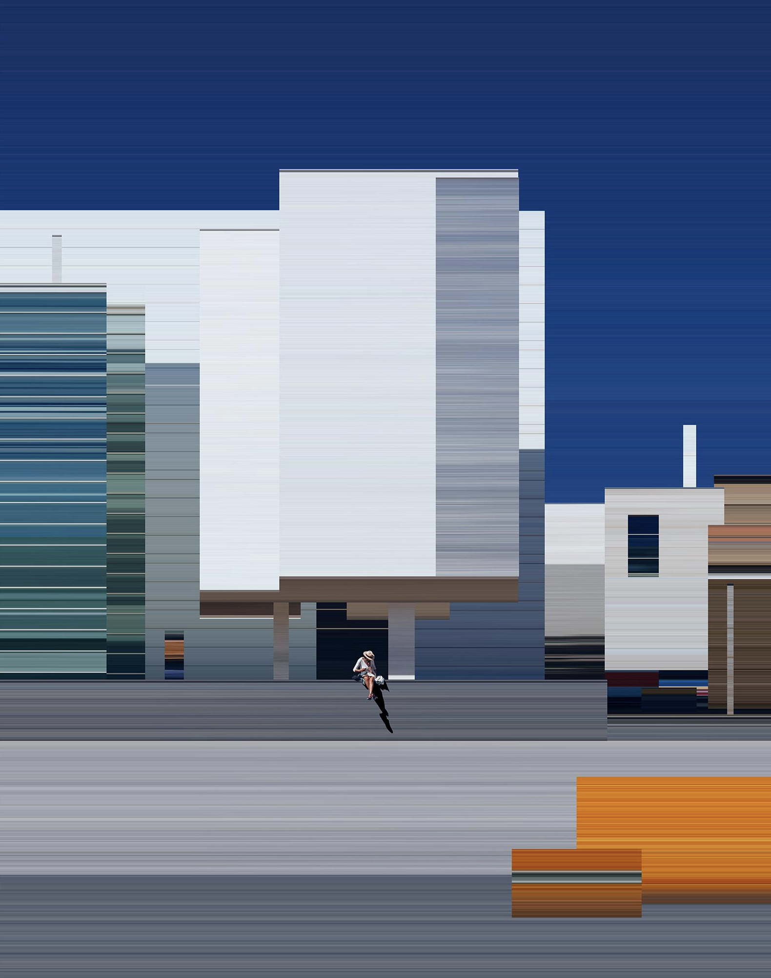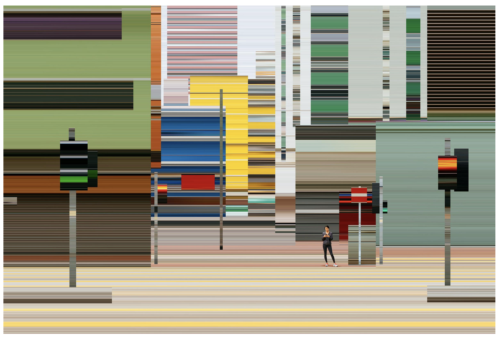 《時間拉伸》系列是一場關于感知邊界的探索,每一幅作品都構建了一個超現實的視覺場域。藝術家以全球多個城市為拍攝背景,從繁華的都市街道到靜謐的自然角落,卻通過 “拉伸時間” 的創作手法,將周圍的環境拆解、扭曲、重組。畫面中,中央人物始終保持著清晰、穩定的姿態,仿佛被按下了暫停鍵,脫離了時間的洪流;而背景中的建筑、街道、光影則被無限拉長、模糊,化作流動的色彩與線條,如同被時間的浪潮沖刷過的痕跡。