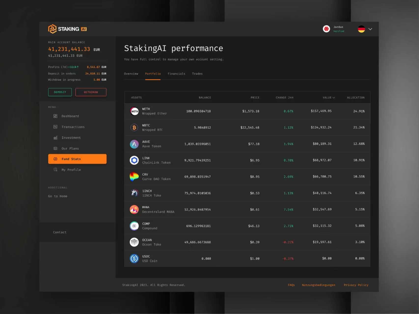 左側核心指標區:將 “總余額、利潤、待處理訂單” 等關鍵數據置頂,用 “大號數字 + 色彩標注”(如利潤的 “+5,631.61 EUR”)讓投資者 1 秒掌握賬戶全局 —— 相比傳統加密界面的 “數據分散”,這種設計讓 “賬戶健康度” 成為視覺焦點。