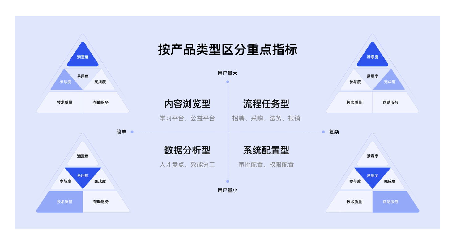 不同產品的體驗側重點差異顯著,盲目套用全量指標會導致資源浪費。需結合 “產品類型象限” 與 “生命周期理論” 精準定位核心指標: