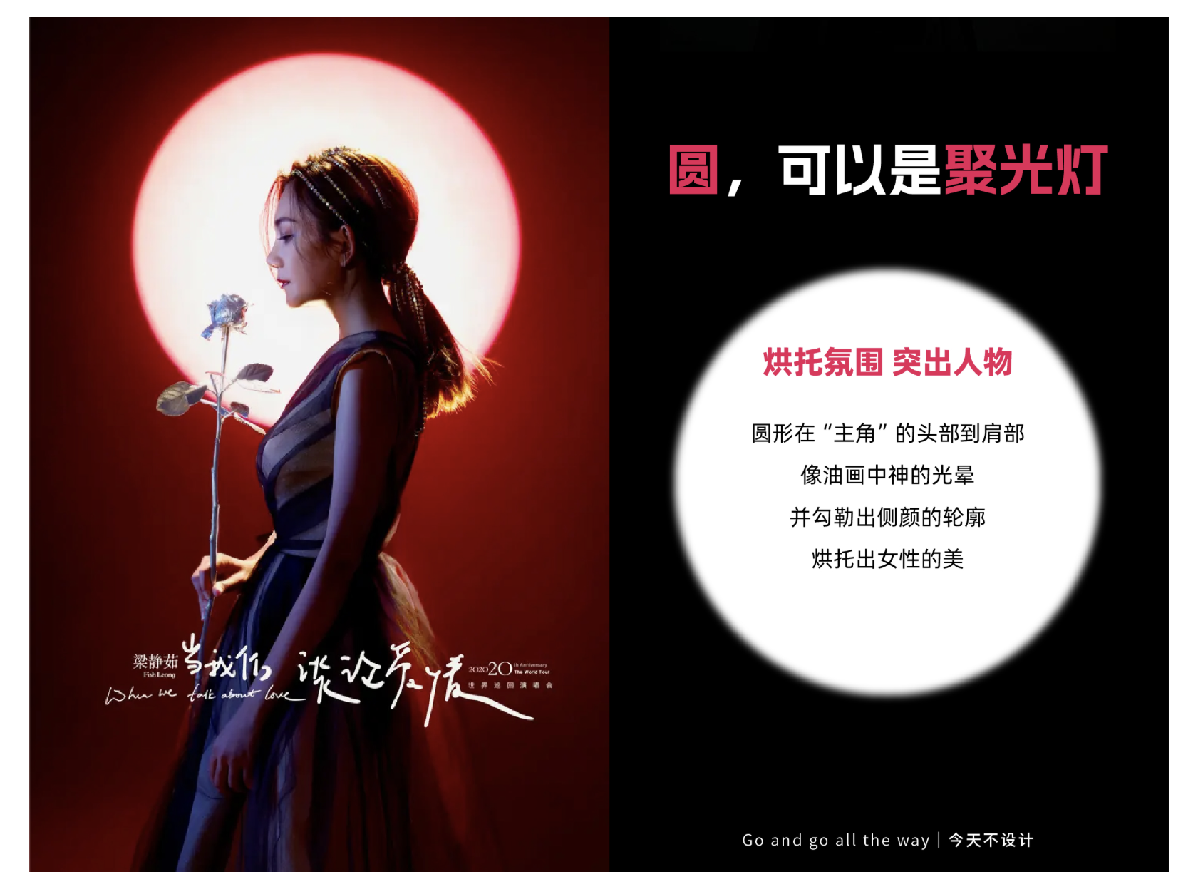 圓形最經典的用法之一,是化作 “聚光燈”,在畫面中形成視覺焦點,同時烘托特定氛圍。這種設計邏輯源于現實中的光影體驗 —— 聚光燈的圓形光束能隔絕干擾,讓觀者注意力瞬間集中于核心主體,海報設計中便借用這一原理,通過圓形光影的明暗對比、輪廓勾勒,突出人物或關鍵元素,傳遞情緒基調。