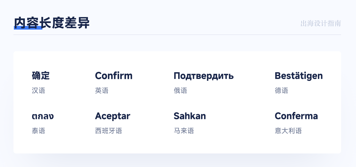 - 文本長度差異:大多數表音語言(如英語、俄語、德語)的文本長度比中文長 30%~50%,直接套用中文排版會出現文字截斷、布局錯亂的問題。例如中文 “確定” 僅 2 字,英語 “Confirm” 為 7 字母,俄語 “NoдtBepAиTb” 長達 11 字符,空間預留不足會導致關鍵信息不可讀。