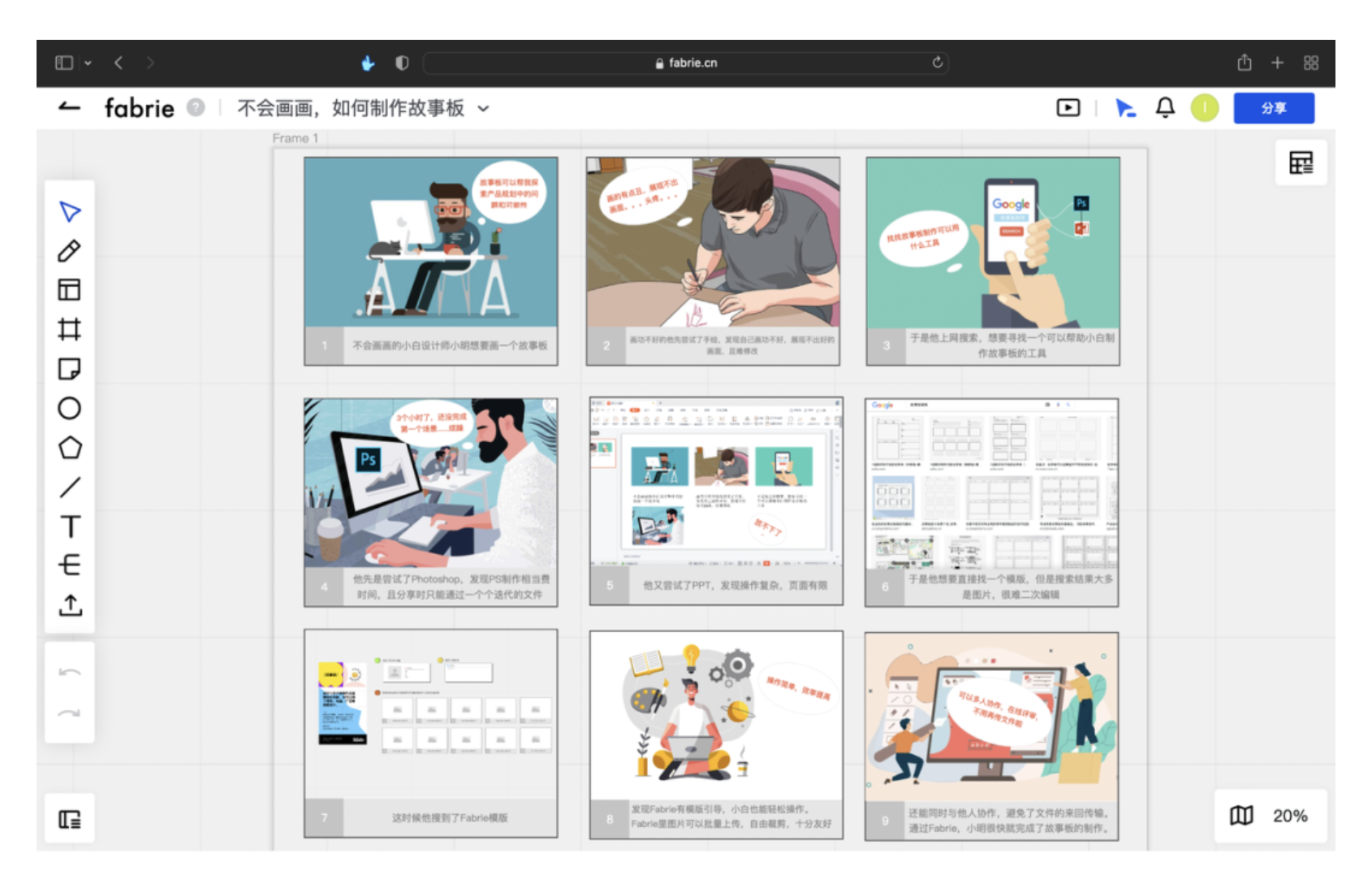 - 故事板:即使不會畫畫,也能通過模板快速搭建場景,用圖片、文字還原用戶使用產品的過程,直觀展現設計價值。