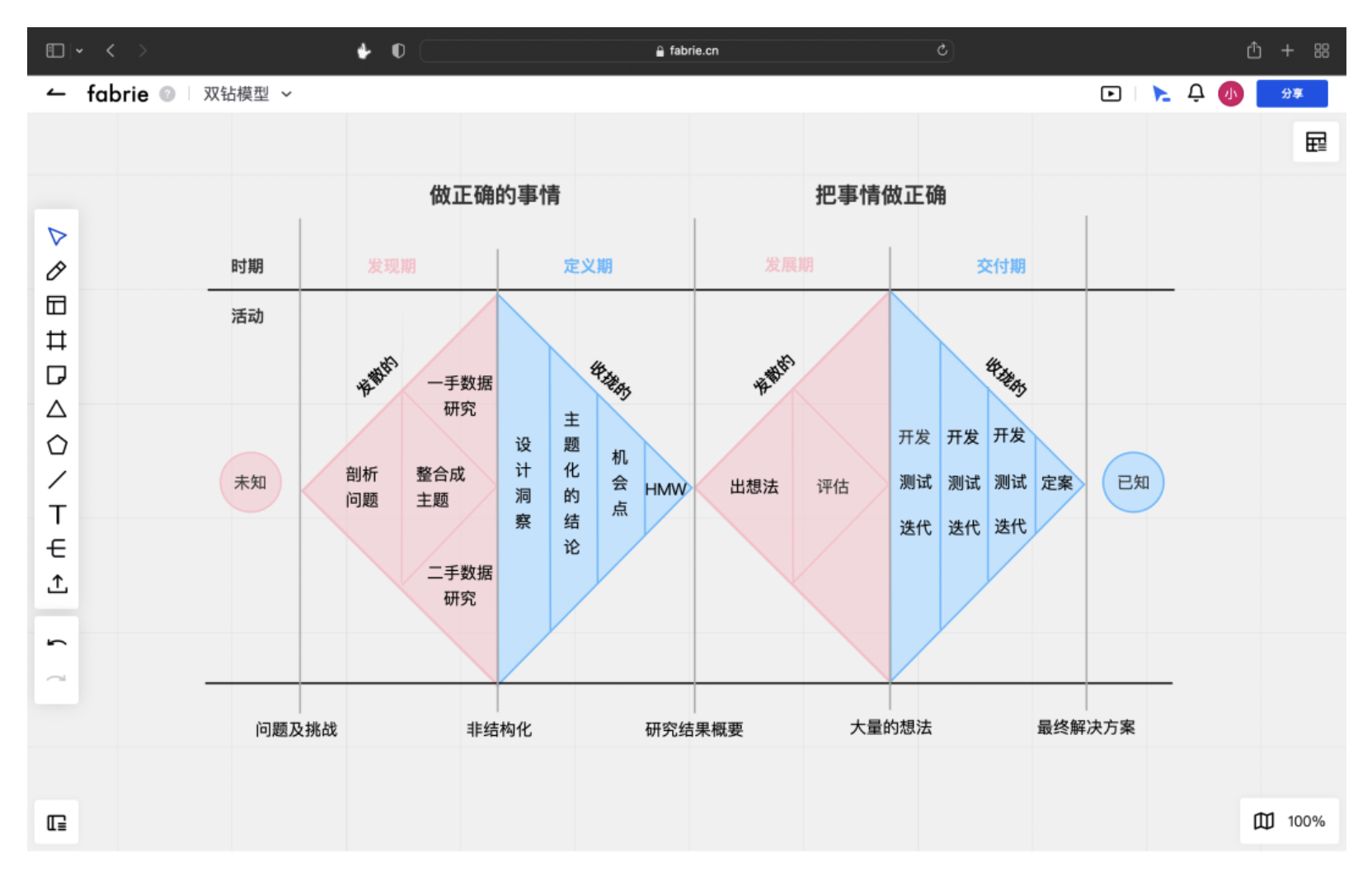 雙鉆模型是設計思維的核心框架,分為發現期、定義期、發展期、交付期四個階段,通過 “發散 - 收攏” 的循環確保設計方向正確且執行到位。但很多設計師因缺乏工具支撐,難以完整踐行這一流程。